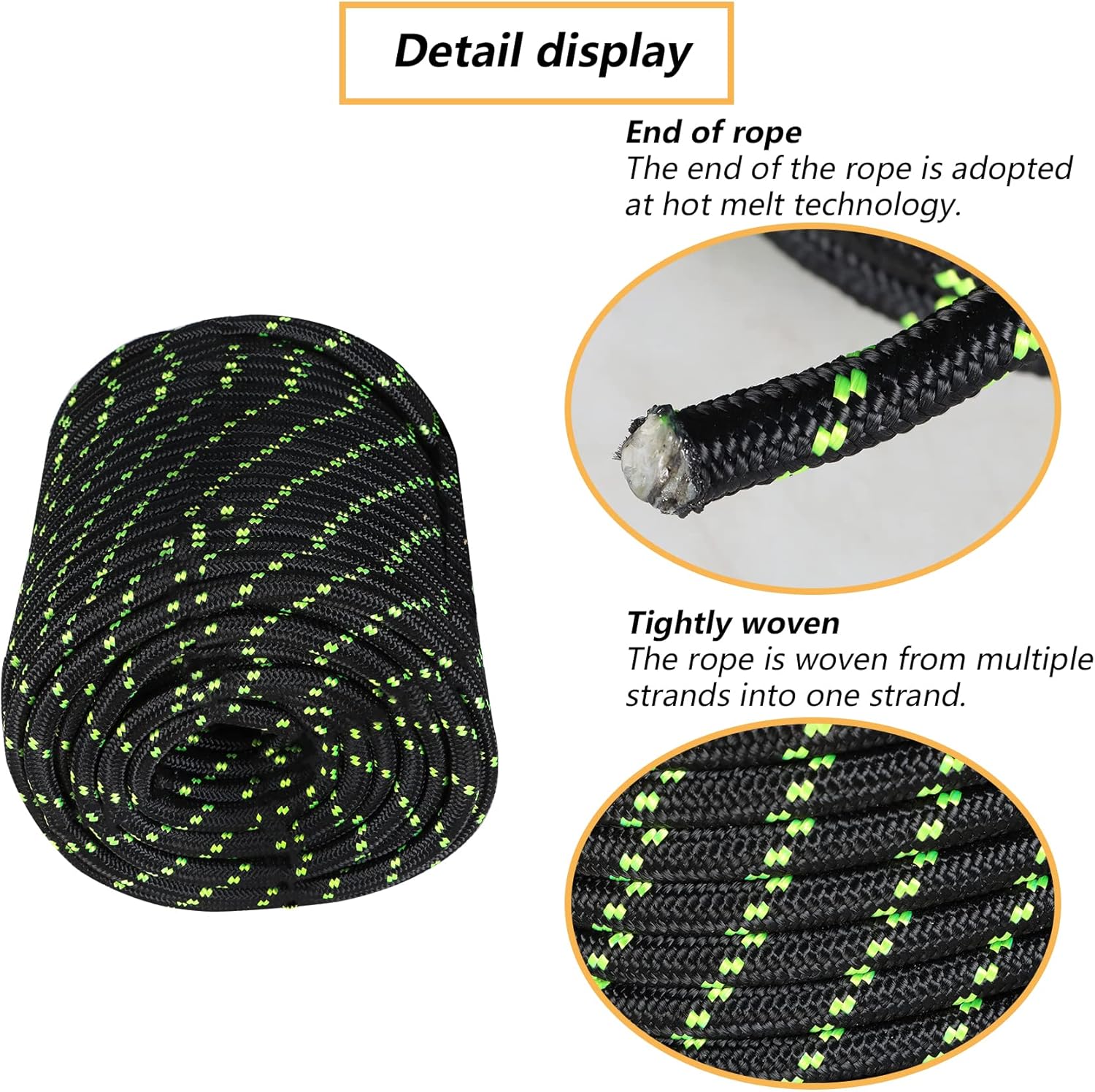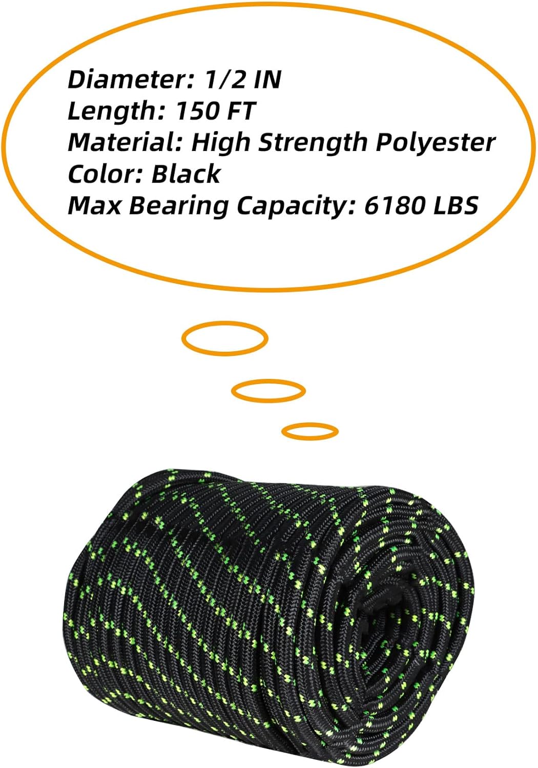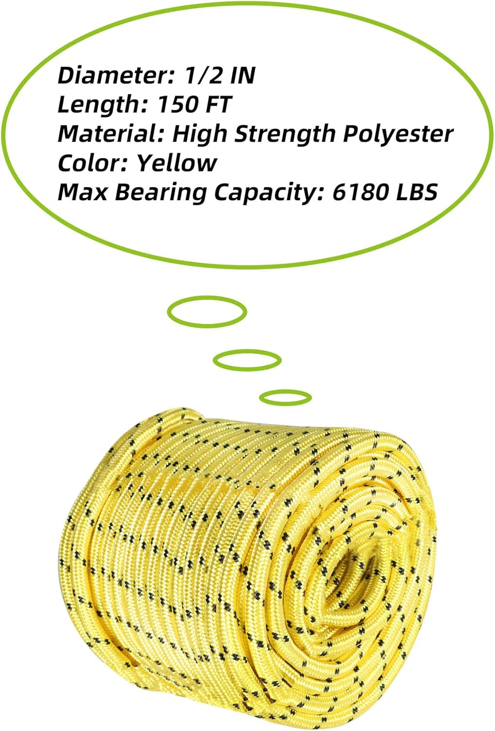 Specifications Diameter: 1/2 In Length: 100 FT Color: YellowMaterial: Polyester Max load: 6180 Pounds Features The rope is made of high quality polyester material and adopts the most advanced weaving technology. Wear sturdy, suitable for long term use. The rope is very sturdy, with a maximum load of 6180 pounds and a long life. It has a wide range of applications and is very suitable for both commercial and household use. Note The rope shall not touch sharp objects to prevent the rope from breaking.