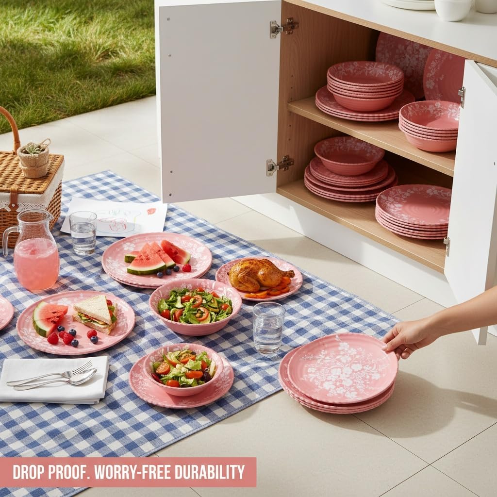 Let your dining table bloom with everlasting spring daisies. The design of this dinnerware is inspired by blossoming flowers, with lively daisy patterns cleverly combined with soft pink, instantly brightening up your dining space. The meticulously crafted wavy edges not only revive the charm of classic vintage styles but also create a rich layered effect under the light. As a set of bamboo melamine dinnerware, it skillfully blends the natural affinity of organic elements with the practicality of modern materials, offering a lightweight, sturdy, and pleasantly tactile dining experience. We believe that beautiful design should serve an effortless life. This 12-piece pink dinnerware set is thoughtfully configured, sufficient for a small gathering or daily family meals. It includes everything from dinner plates for main courses to bowls for salads and cereals. Its dishwasher-safe feature makes post-meal cleanup simple and efficient. We recommend avoiding high-temperature exposure to maintain its vibrant colors and perfect condition for years to come. You can also unleash creativity by mixing and matching it with pieces of different styles to create a unique tablescape. This set embodies a gentle and joyful attitude towards life. Whether preparing a loving breakfast for your family or enjoying a leisurely afternoon tea with close friends, it makes these moments sweeter and more memorable. Choosing LYMSTE means not only selecting a high-quality set of pink dishes but also embracing a gentle philosophy of adorning daily life with beauty and managing life with care, turning every meal into a cherished memory.