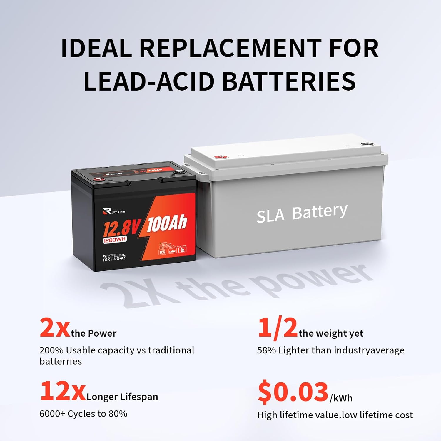 About the RVLithTime12V100Ah Powerful Lithium Phosphate Battery, This high-quality and powerful lithium rv batteries are a great replacement or upgrade for any application currently using deep cycle gel, AGM, or flooded lead acid batteries. This battery is suitable for a variety of indoor and outdoor applications. The RVLithTime 12V 100Ah lithium battery shines when camping off the grid. Heavy-duty case Maintenance-free handle ensures safe retention while on the move: Lithium Iron Phosphate (LiFePO4)Nominal Voltage:12.8V Nominal Capacity:100Ah Cycle Life:100% Depth of Discharge (DOD). Charging Voltage:14.2 - 14.6V(Maximum per core:3.65V) Cut-off Voltage:10.8V Depth of Discharge(DoD):100% Standard Charging Current:10A/20A Charging Time:Approx. 10 hours (10A),Approx. 5 hours (20A) Maximum Continuous Charging Current:100A Peak Discharge Current :280A(Applied for 5 sec.), Operating Temperature Characteristics: Charging 0° C~50° C, Discharge -20° C~60° C, Storage -10° C~50° C, Battery Dimensions (inches): 13 x 6.8 x 8.4 inches, Weight: 24.25 lbs/100.99 kg, Battery Terminals: M8, Charging Tips: Use Li-Ion Battery Charger to Maximize Capacity; Select B04 Mode (when charging LiFePO4 battery cells with solar inverter). battery cells when charging with a solar inverter). Connection Tips: (Please refer to the product manual for details) Our batteries can be connected in parallel for greater capacity. Series connection: Up to 4 identical batteries, up to 48 volts. Parallel connection: the voltage difference between the same cell and cells must be less than 0.5V. Supports fast charging and solar panel charging.
