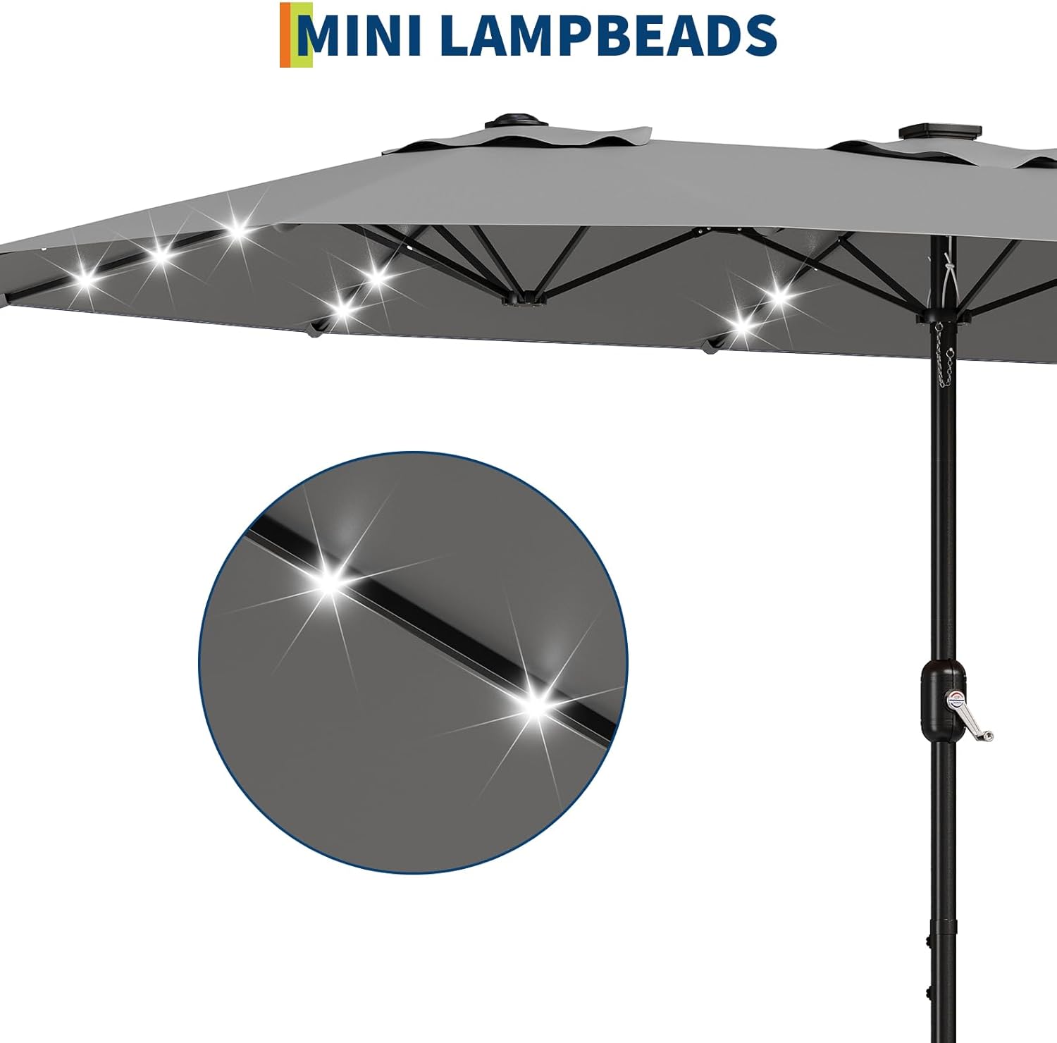 Enhance your outdoor living space with our 15FT Extra Large Patio Umbrella, designed to provide both style and functionality. This oversized double-sided market umbrella measures an impressive 15 x 9 feet, offering up to 135 square feet of generous shade—perfect for accommodating 4 to 8 people comfortably around your patio dining set or outdoor furniture. Whether you're hosting a family gathering or a casual evening with friends, enjoy 9 to 12 hours of warm, inviting light from 36 high-brightness LED solar lights integrated seamlessly into the umbrella. These LEDs emit a soft, natural glow that creates a cozy atmosphere without straining your eyes.Crafted for durability, the umbrella features a sturdy 1.9-inch thick alloy steel pole and 12 strong ribs, providing excellent wind resistance and long-lasting performance. The smooth crank lift system allows for effortless opening and closing, making it easy to adjust your shade as needed. The canopy is made from high-density, heavy-duty 180gsm polyester fabric that is waterproof, UV-resistant, and fade-resistant, maintaining its vibrant color for up to three years despite exposure to the elements.For added stability, the umbrella comes with a durable metal base and two sandbags (sand not included) that can be filled with 100 to 180 pounds of sand each, ensuring your umbrella stays secure even on breezy days. Measuring 15 x 9 x 7.5 feet, this umbrella is ideal for pools, gardens, backyards, and decks, making it a versatile addition to any outdoor setting.Experience the perfect blend of shade, light, and durability with this extra-large patio umbrella—your ultimate solution for stylish and comfortable outdoor living.