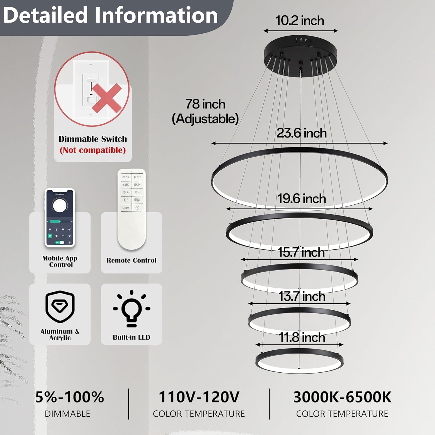 | Other Special Features of the Product | Adjustable Height, App control, Dimmable, Remote, Sloped ceiling mount available |