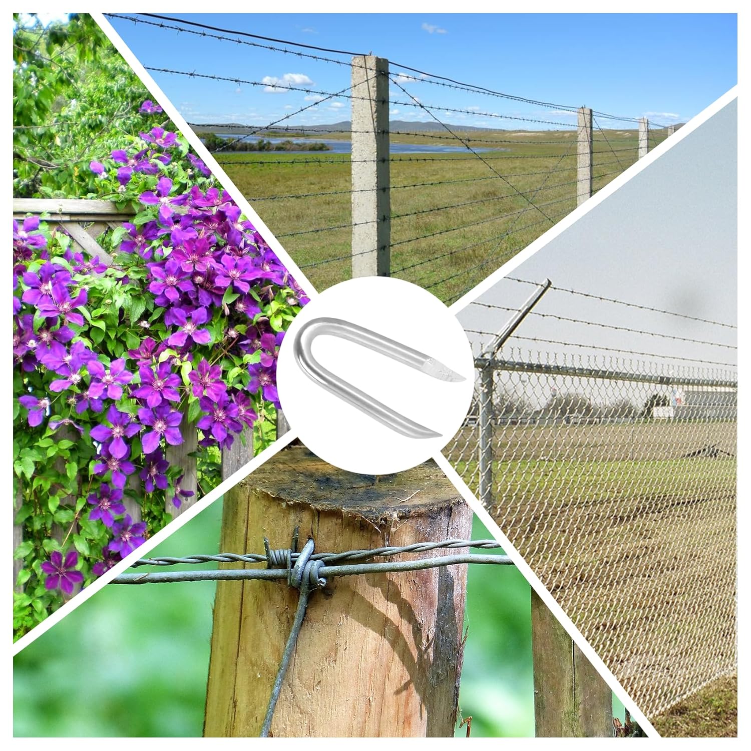 Strong & Sharp Made of Galvanized Carbon Steel, Sturdy and Durable, not easy to break or bend. High Quality Non-fading, Rust and Corrosion Resistant. Widely Used Ideal for fence, wire mesh and woven fabric installation. Easy to Use The installation of U Shaped Staple is convenient and efficient; When hammer the Fastening Nails in wood or drywall, they can hold stuffs stably and are durable.
