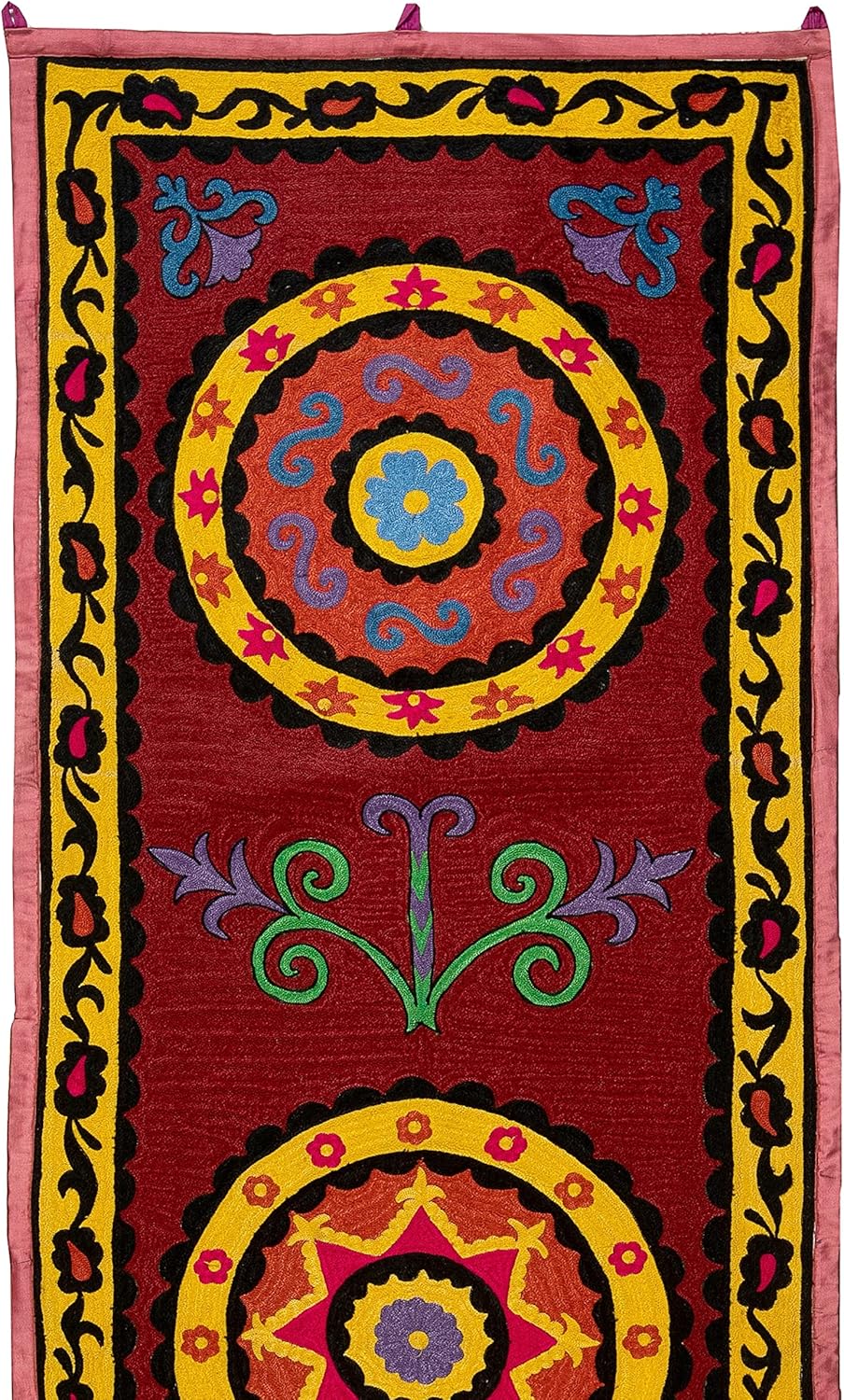 Suzani' is from the Persian 'Suzan' which means 'needle'. Suzani textiles were traditionally made by brides as part of their dowry, and were presented to the groom on the wedding day. These large embroidered dowry textiles of Turkish groups are so named because of the many hundreds of hours of needlework required to produce them. The colors, all rendered in silk, are vivid and natural. On the wall, this textile has a soft, yet monumental presence that speaks volumes about another place, time and era. This fine embroidery can be used as a wall-hanging, bed cover, sofa spread, table cover, screen etc.