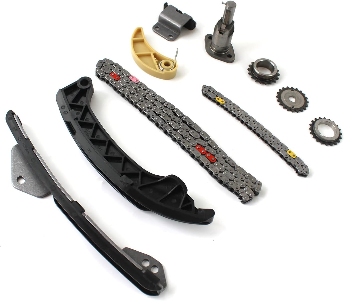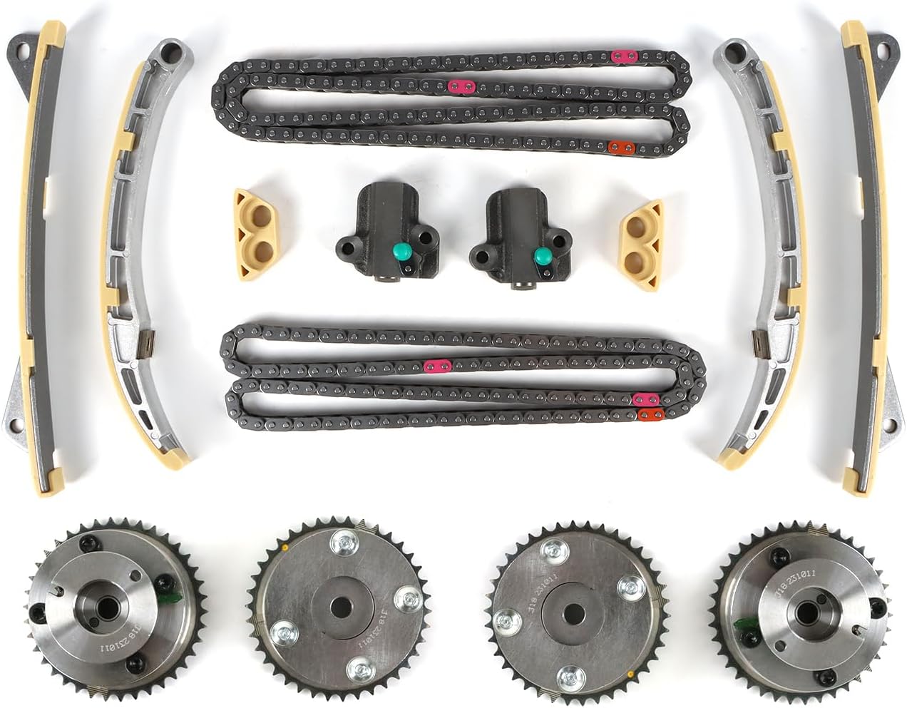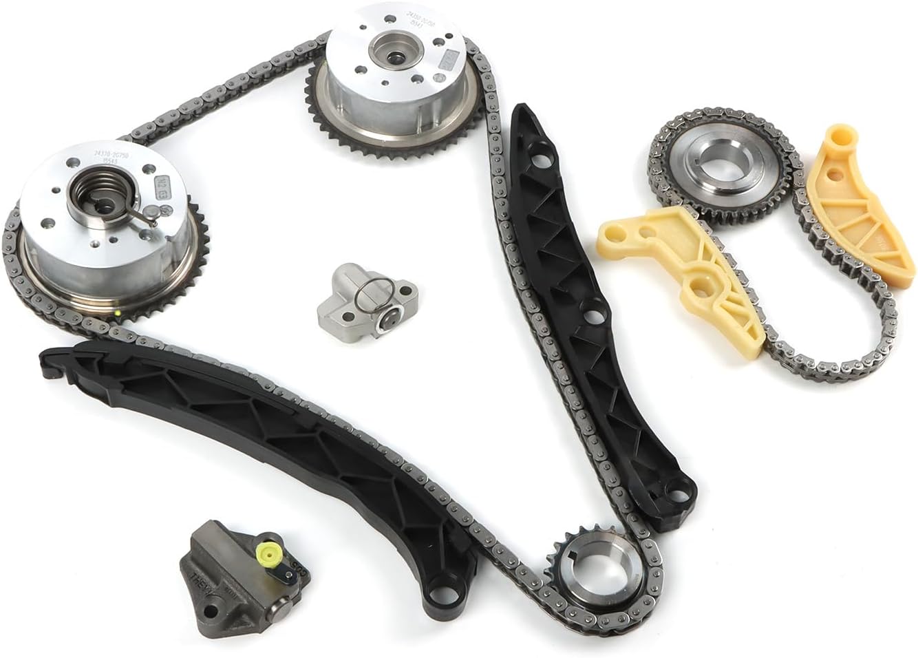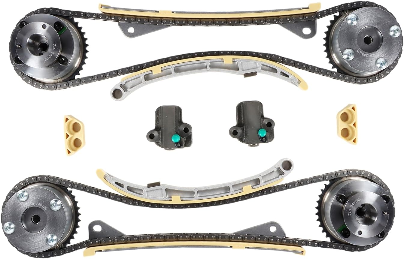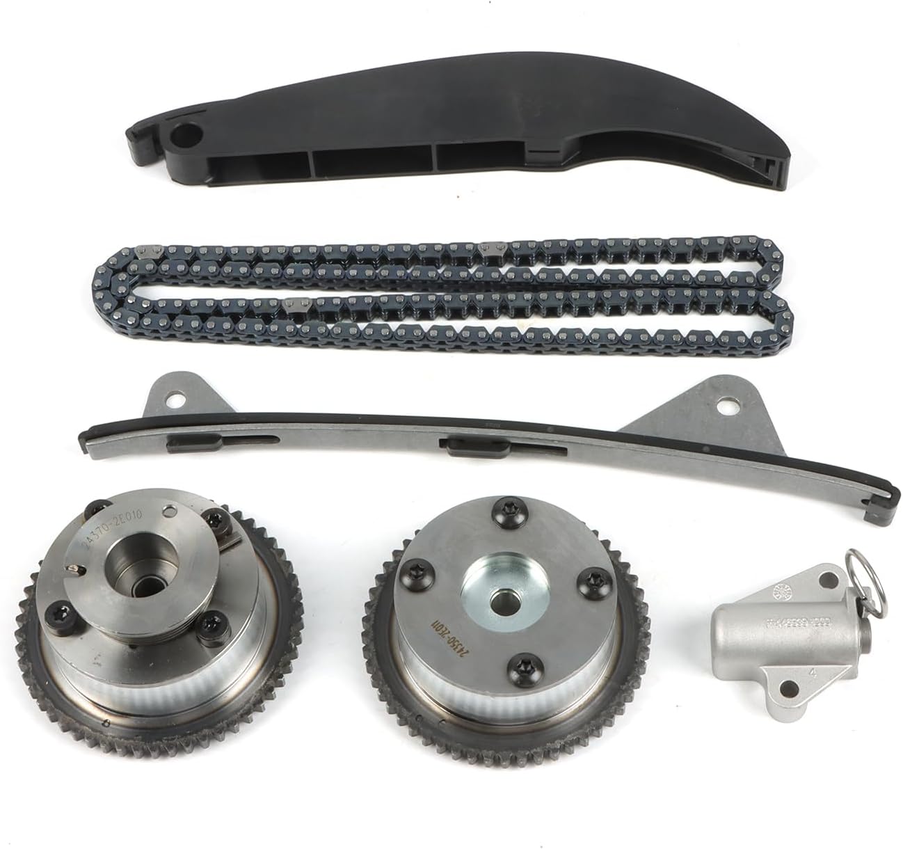 Specification:Type Name: Timing Chain Kit + 2PCS Intake Exhaust Camshaft AdjustersCondition: New and High QualityPart Number: 24321-2E200 24410-2E000 24420-2E200 24430-2E000243212E200 244102E000 244202E200 244302E000 244302J00024430-2J000 24350-2E201 24370-2E200 243502E201 243702E200Fitment Type: Direct ReplacementVehicle Fitment:Compatible with 2014-2020 Elantra GT 2.0L 1999CC l4 GAS DOHC Naturally Aspirated;Compatible with 2014-2020 Tucson 2.0L 1999CC l4 GAS DOHC Naturally Aspirated;Compatible with 2016-2020 Tucson 2.0L 1999CC 122Cu. In. l4 GAS DOHC Naturally Aspirated;Compatible with 2017-2020 Optima 2.0L 1999CC 122Cu. In. l4 FULL HYBRID EV-GAS (FHEV) DOHC Naturally Aspirated;Compatible with 2017-2020 Optima 2.0L 1999CC 122Cu. In. l4 PLUG-IN HYBRID EV-GAS (PHEV) DOHC Naturally Aspirated;Compatible with 2016-2019 Sonata 2.0L 1999CC l4 FULL HYBRID EV-GAS (FHEV) DOHC Naturally Aspirated;Compatible with 2016-2019 Sonata 2.0L 1999CC l4 PLUG-IN HYBRID EV-GAS (PHEV) DOHC Naturally Aspirated;Compatible with 2014-2019 Forte 2.0L 1999CC 122Cu. In. l4 GAS DOHC Naturally Aspirated;Compatible with 2014-2019 Soul 2.0L 1999CC 122Cu. In. l4 GAS DOHC Naturally Aspirated;Compatible with 2014-2018 Forte5 2.0L 1999CC 122Cu. In. l4 GAS DOHC Naturally Aspirated;Compatible with 2014-2016 Elantra 2.0L 1999CC l4 GAS DOHC Naturally Aspirated;Compatible with 2014-2016 Forte Koup 2.0L 1999CC 122Cu. In. l4 GAS DOHC Naturally Aspirated;Compatible with 2014 Elantra Coupe 2.0L 1999CC l4 GAS DOHC Naturally Aspirated;Package Includes:1x Intake CVVT Gear1x Exhaust CVVT Gear1x Timing Chain - Roller 72 LINKS1x Chain Guide Rail1x Tensioner Arm Guide Rail1x Timing Chain Tensioner▶Notice:1. Please confirm your Vehicle Identification Number with our part number or interchange part number before ordering.2. Please make sure that the model number, and photo are the same as yours before ordering.3. If not sure, please send me some pictures of your original item & VIN number before ordering.4. We recommend professional installation when you are not familiar with it. Be careful when installing and testing, otherwise, it will cause damage to the parts.5. Communication is the best way to solve the problem. If you have any problems after purchasing, please contact us in time, before opening return or case.▶Excellent After-Sales Service:Kessocco has a professional technical team, that not only offer top-notch products but also provide outstanding after-sales service. Customer satisfaction is of utmost importance to us. Our professional team is available to support you after your purchase, assisting with any inquiries and providing technical guidance