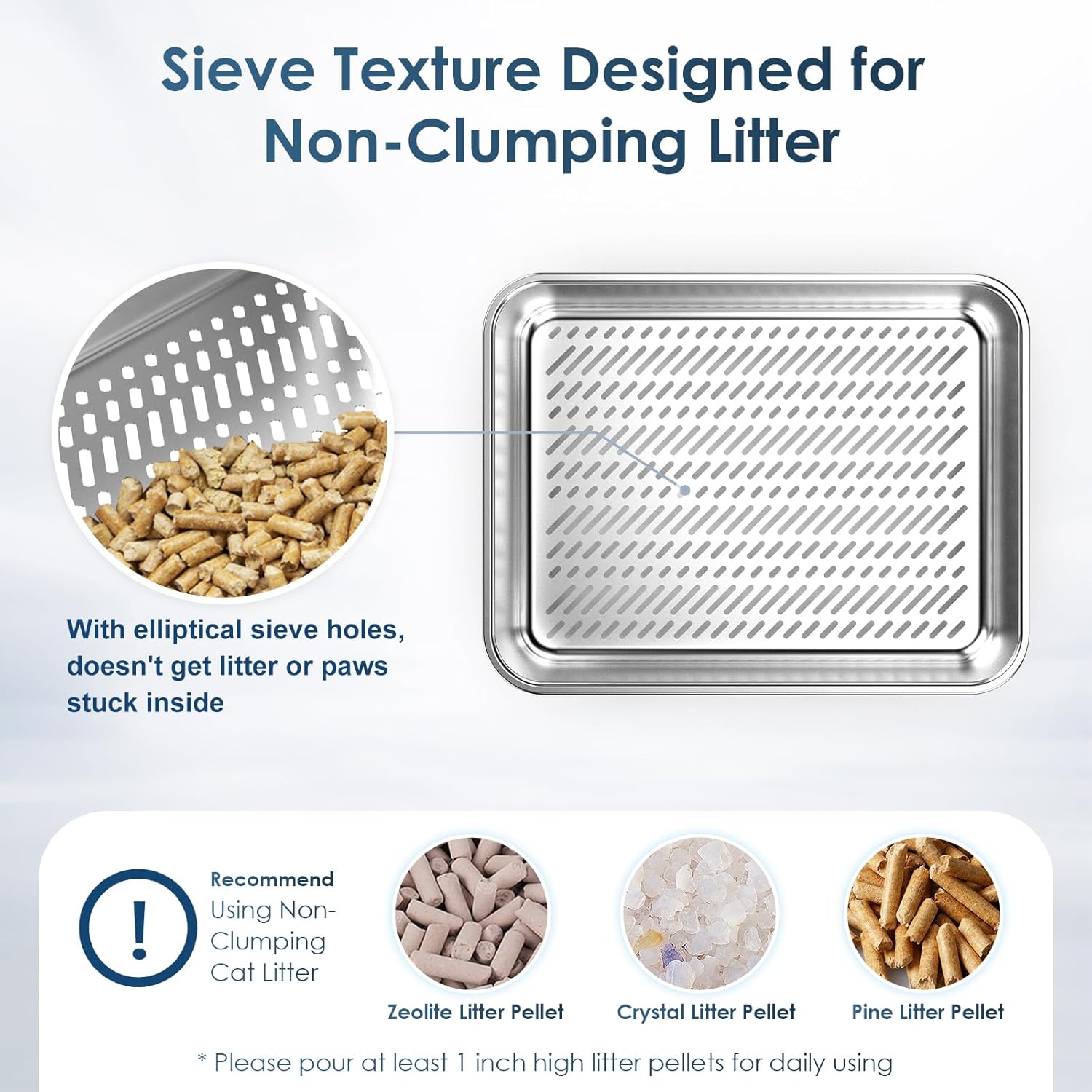 2-Pack Stainless Steel Sifting Cat Litter Box – Odor-Free & Easy-Clean with Pine Pellets & Pee Pads Upgrade your cat's daily routine with our stainless steel litter box 2-pack, designed for pine pellets and pee pad compatibility. This high sided litter box reduces tracking and keeps your home fresh—ideal for small cats, kittens, and apartment living. Efficient Sifting Design: The built-in sifting tray separates clean pellet litter from waste—perfect for sifting litter box with lid users who want a cleaner solution. Quick-Dry & Odor Control: Urine passes through and is absorbed by the pee pad below—ideal for covered litter boxes for cats and odor-sensitive homes. Durable & Rustproof: Made from food-grade stainless steel, this litter box stainless steel resists scratches and rust, outlasting plastic pans. Easy to Clean: Simply lift the sifting tray, remove waste, and replace the pee pad—a hassle-free cat litter pan for busy households. Complete 2-Pack System: Includes two boxes, litter scoops, pee pads, and waste bags—everything you need for a low-maintenance metal sifting litter box setup. Ideal for: Multi-cat households, small apartments, new cat owners, and pet parents wanting a sanitary litter pan that grows with their kitten.