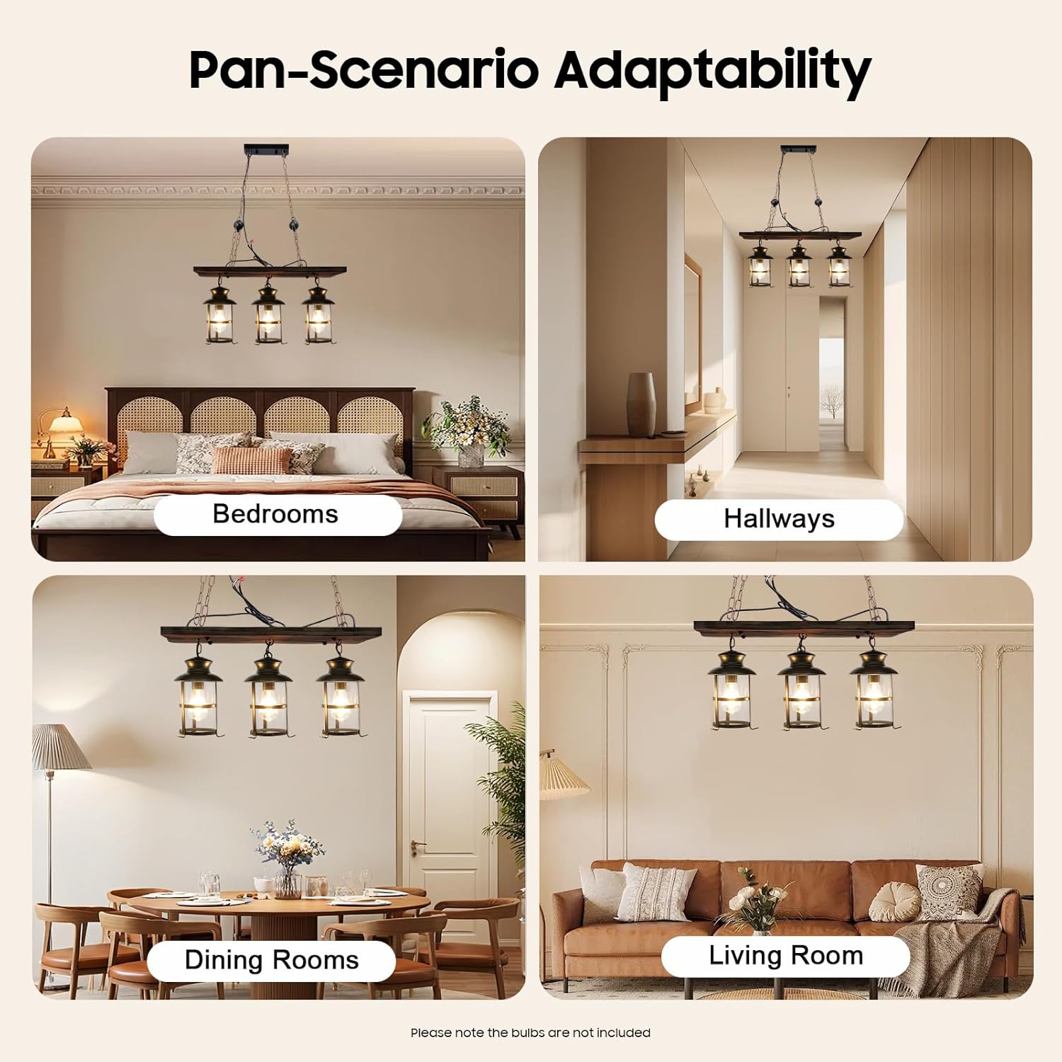 Description:This is a creative antique country chandelier made of solid wood and iron. The unique shape and style make it extraordinarily eye-catching. As a creative decorative chandelier, it not only has a beautiful appearance but also has a wide range of light. In addition, the wood and iron material are solid and durable. It is suitable for homes, bars, cafes, restaurants, hotels, bookstores, clothing stores, studios, etc.Specifications: Style: RetroCategory: Multi Light PendantUses: Indoor LightingShade Shape: CylindricalShade Material: GlassMaterial: Wood & IronShade Color: Black & TransparentVoltage: 110V / 60HzPower Per Bulb: 40WBulb Type: LED / Incandescent / FluorescentBulb Base: E27 / E26Number of Lights: 3 (Bulbs Not Included)Light Height: 100 cm/ 39inchLamp Width: 68 cm/ 27inchWeights&DimensionsPackage Size: 68 * 38 * 24cm/ 27*15*9inchGross Weight: 7kg/15lbsWhat's Included: 1* Metal Base1* Wood Board2* Iron Chains3 * Antique Country LampshadesAll Accessories for AssemblyNotesThis product does not include light bulbs, please purchase light bulbs on your own.Please install the light under the guidance of professionals.Please allow the slight color difference caused by the shooting light and 1-3 cm error due to manual measurement, and make sure you do not mind before ordering.