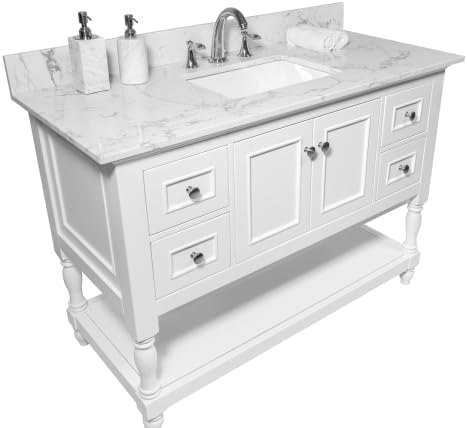 The vanity tops are made of beautiful Engineered stone. All exterior sides are polished for a luxurious look. Each model is complemented with a ceramic Rectangle undermount sink. The matching backsplash is included in each package. Product incude : Stone vanity top + backsplash+ceramic sink [DIMENSIONS] Exterior Dimension 43 inch wide x 22 inch,deep Fits Most Standard 42-in W x 21-in D vanity cabinet 4 inches center faucet holes [Material] Enginnered tone Stone top Size:43X22x3/4 inch [Elegant & Stylish Top] Warmly elegant and stylish Carrara marble vanity top complement most Bathroom designs and coordinate with both light and dark cabinetry High-end and classic natural stone top Pre-sealed and Polished for added protection [Easy to Installation] Top pre-drilled for 8 inch faucet Assembled stylish rectangular white vitreous china under mount bowl with safety overflow hole This top is perfect for quick and easy remodels Obtain the beauty and durability of marble without hiring a professional [PACKAGE INCLUDED] Vanity top with assembled rectangular under mount bowl matching 4inch high Backsplash Besides extremely solid package - very firm carton box with foam is used to transport top making sure a safe delivery (Attention) Faucet and side splash NOT included