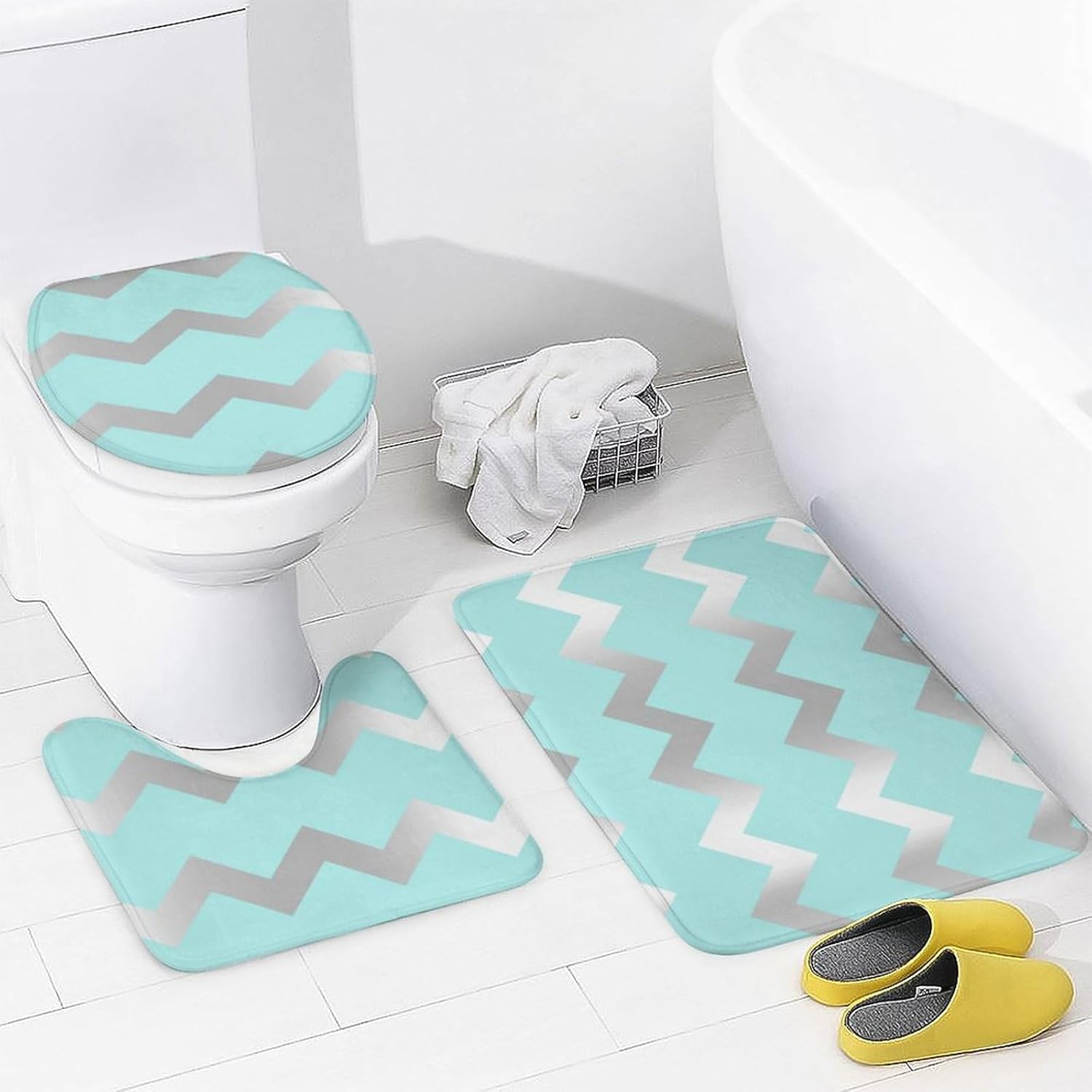 4Pcs Shower Curtain Sets, Chevron Silver Gray Aqua Bathroom Sets with Non-Slip Bath Rugs, Toilet Lid Cover & U Shape Mat, Waterproof Shower Curtain with 12 Hooks, 72"x72"