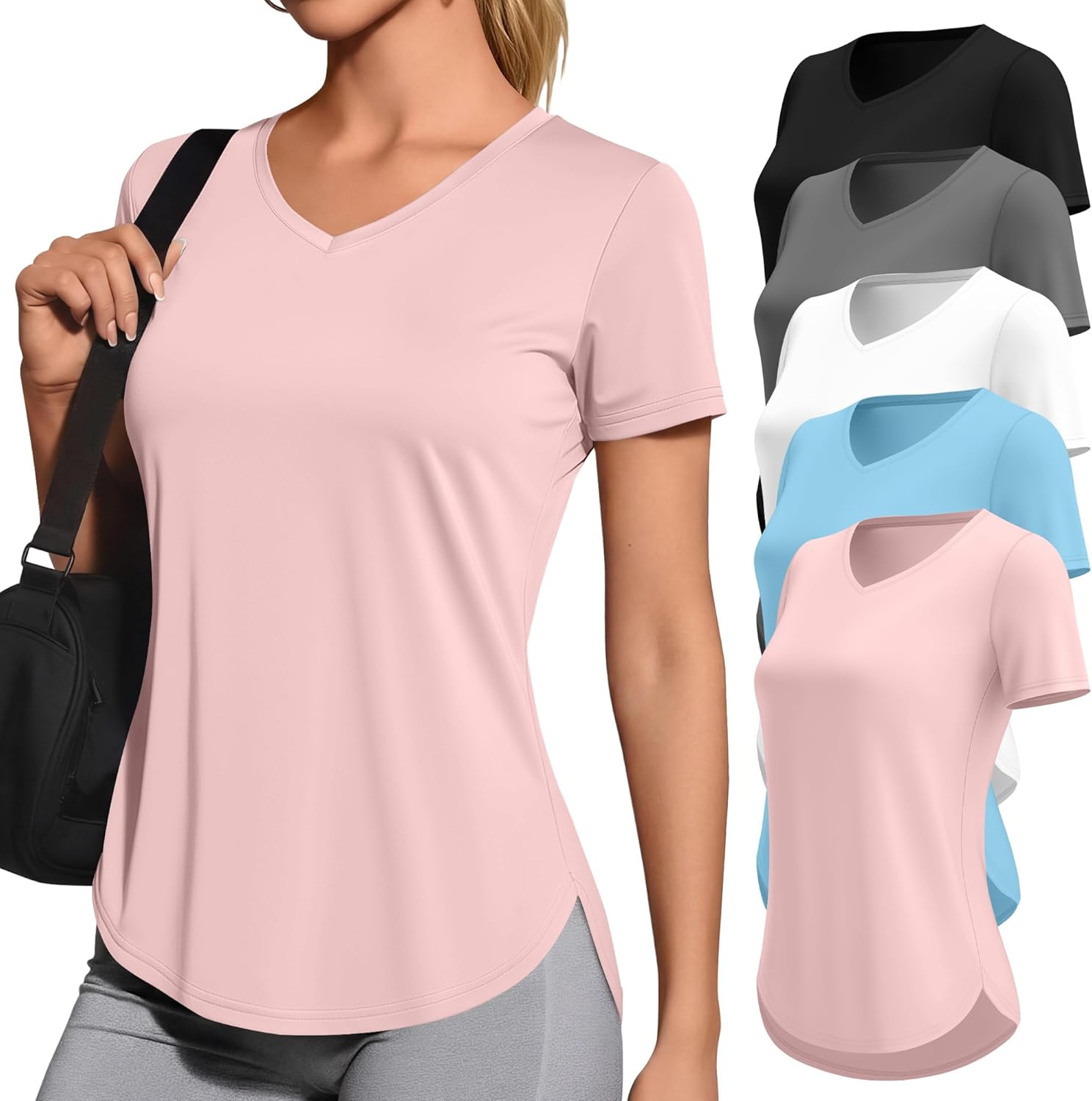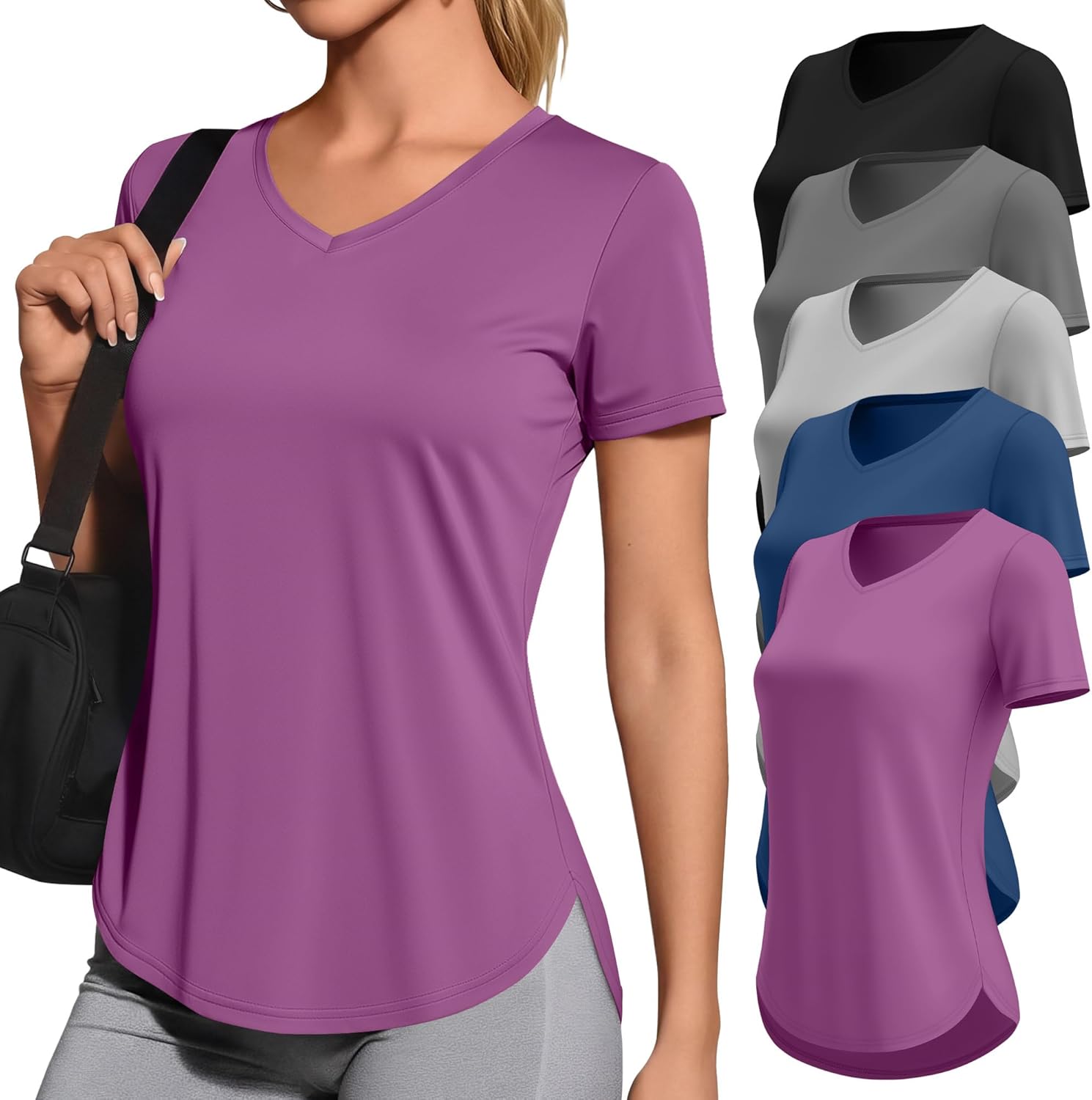 Features: Our women's basic t shirts are made of stretchy fabric, which is soft and flexible, and fits well without hurting the skin Care for the women's summer casual tops is easy. Machine washable or hand wash with cold water, no shrinkage not easy to deform Specifications: Material: 95% Polyester, 5% Spandex Package includes: 5 Pack women's workout shirts Notes: Manual measurement, please allow slight errors on size. The color may exist a slight difference due to different screen displays