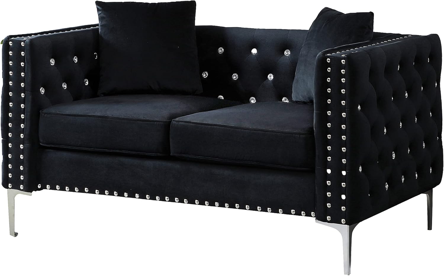 59.4 Inch Wide Black Velvet Sofa with Jeweled buttons,Square Arm ,2 Pillows Covered in soft velvet,jeweled buttons tufted. Pocketed coil cushion seats make this set comfortable and durable. Silver nailhead trimmed and finished off with chrome-plated legs, it also includes 2pcs throw pillows. KD design allows for easy delivery to any home or room.