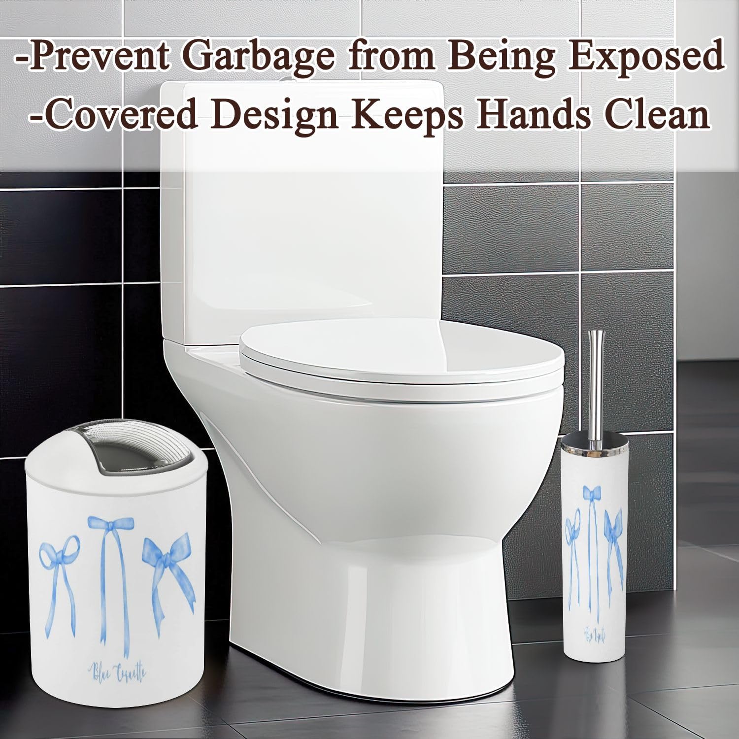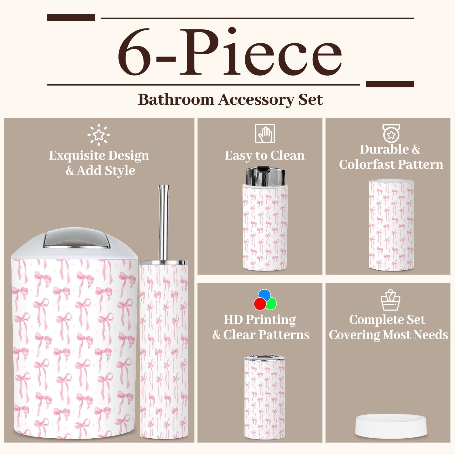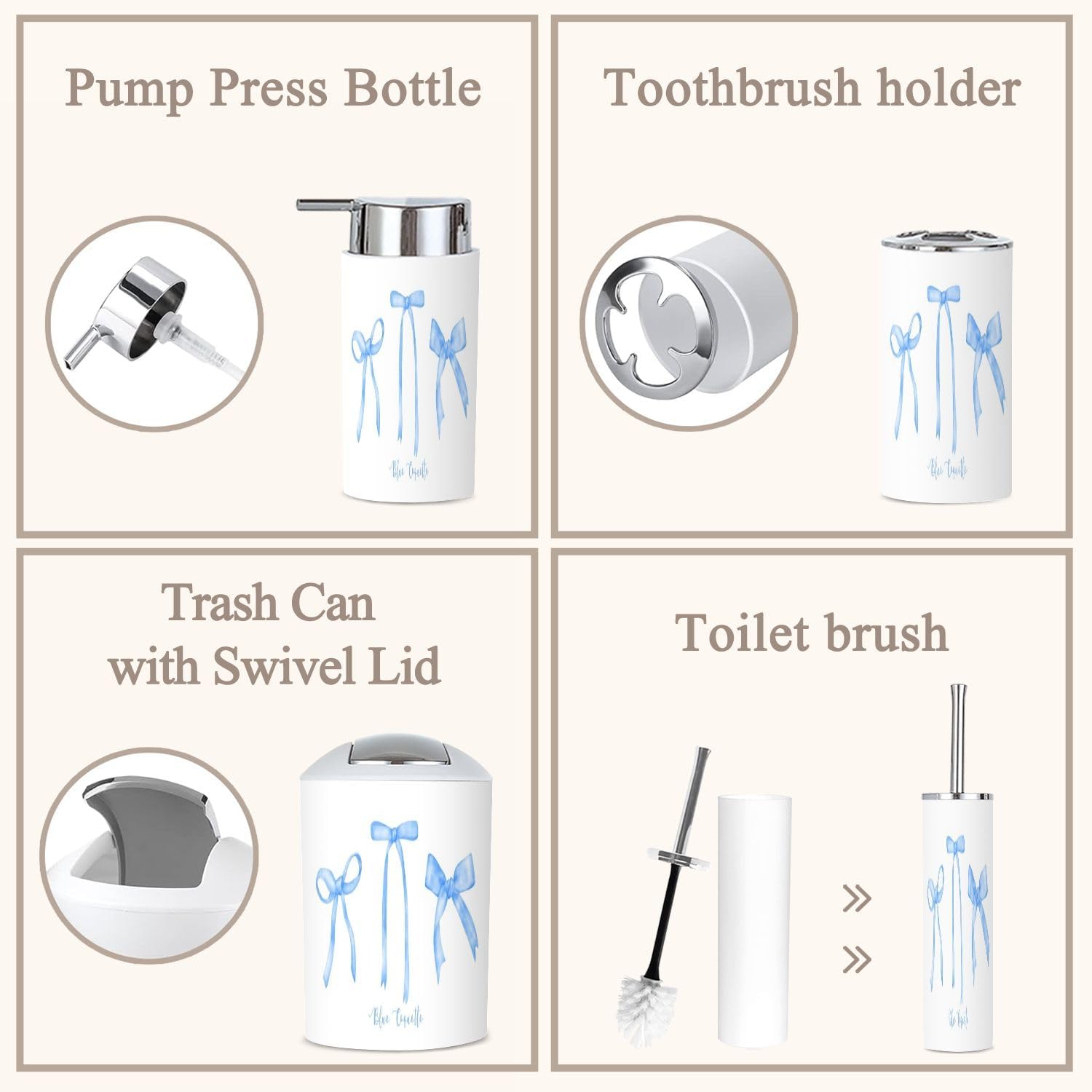 Includes 6 pieces: -Soap dish Keep soap dry. Keep the sink dry without soap stains. -Soap dispenser Press with one hand and it will automatically rebound. You can also put other liquids such as hand soap, dishwashing liquid, lotion, shampoo, shower gel, massage oil, etc. -Toothbrush cup The size is slightly different from the toothbrush holder, which is easy to distinguish. -Toothbrush holder The lid is a petal design, which can keep each toothbrush separate from each other and keep it dry and tidy. The lid is detachable, and you can also use it as another toothbrush cup with your family after removing the lid. -Trash can With a rotatable lid to prevent garbage from being exposed and fix the garbage bag. -Toilet brush The lid is designed not to dirty your hands, and odor will not escape. Attention: 1. Due to manual measurement, there may be slight differences in size. Please confirm the size before purchasing. 2. We will serve you carefully, please ask us if you have any questions.