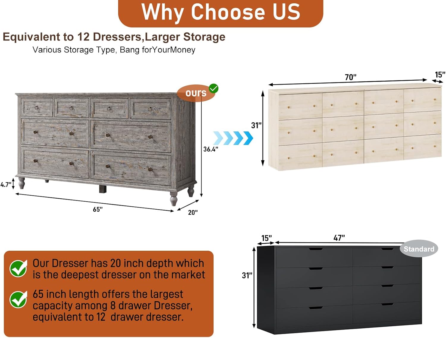 | Size | 20"D x 65"W x 36"H (8 Drawers) |