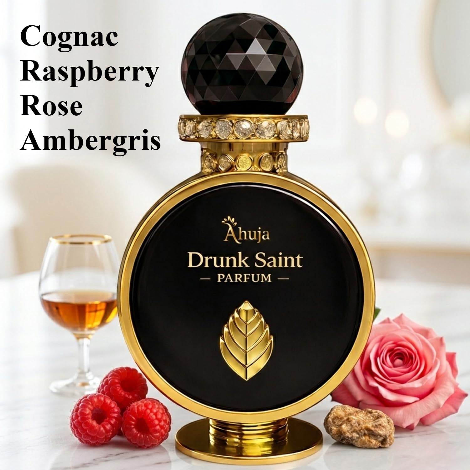 AHUJA – DRUNK SAINT | INTOXICATION AS ART Drunk Saint opens with a seductive contradiction — a warm pour of aged cognac spiced with cinnamon and softened by juicy raspberry. It feels like the first forbidden sip: dark, sweet, and inviting. At the heart, a bloom of rose rises through atlas cedarwood and sacred myrrh, revealing a sensual, devotional core that blends beauty with shadow. The dry down melts into ambergris, creamy sandalwood, and smooth tonka bean, leaving a warm, sacred trail that lasts all night. Crafted with 30% organic/natural oils, Drunk Saint is bold, long-lasting, and unapologetically intoxicating. The fragrance is housed in a high-luxury collector’s box — embossed black exterior, gold emblem, floral black-rose interior, and an ornate golden arch that frames the round black bottle like a jewel. Every detail is designed to feel sacred, sensual, and instantly iconic. Ahuja Parfum — “Even angels get drunk.”