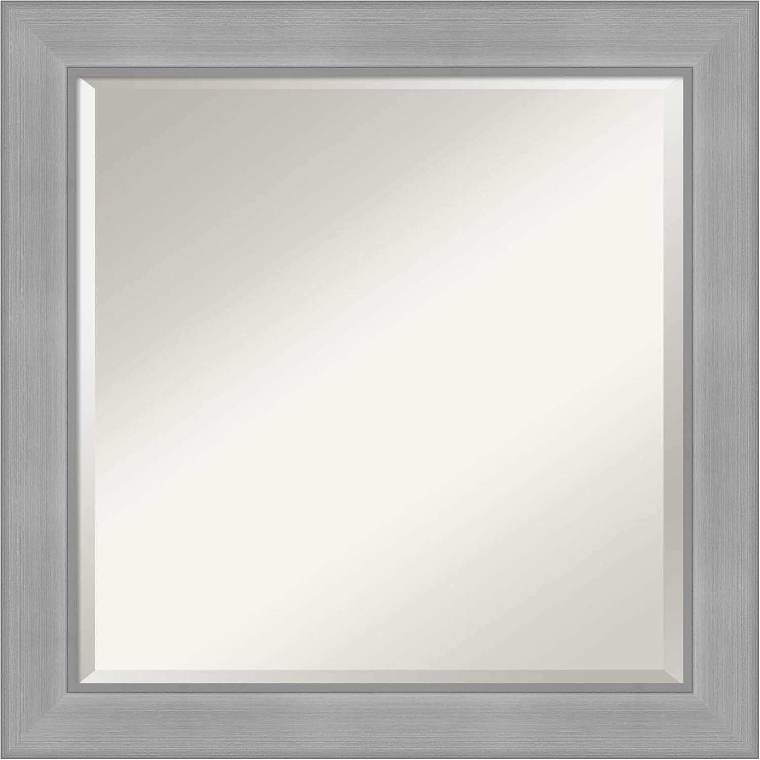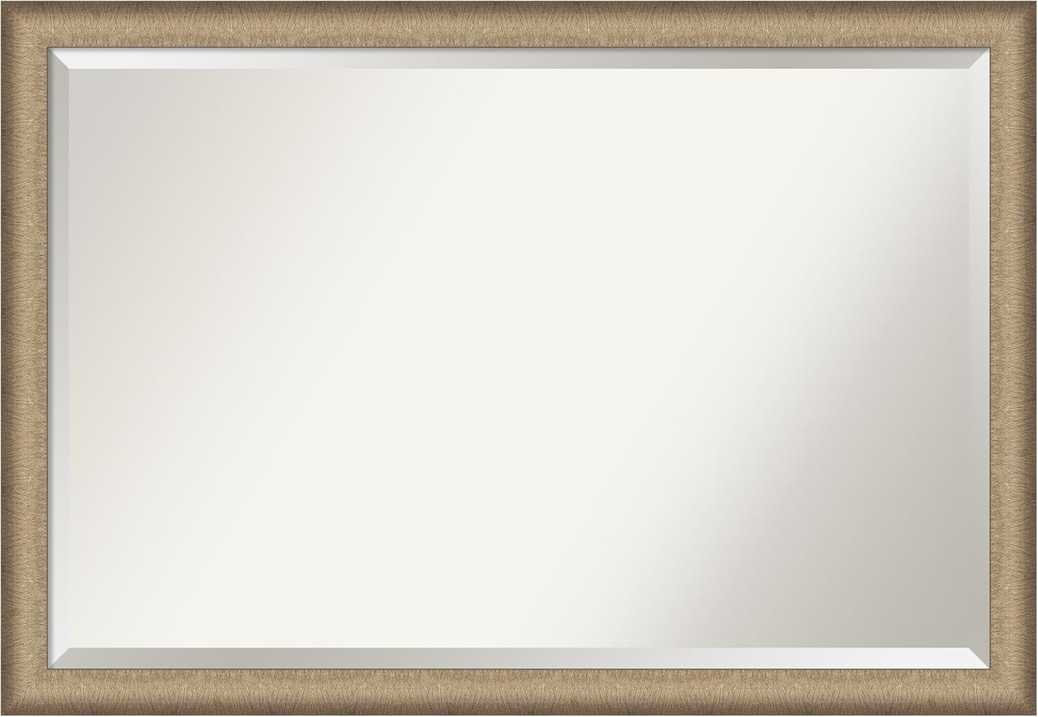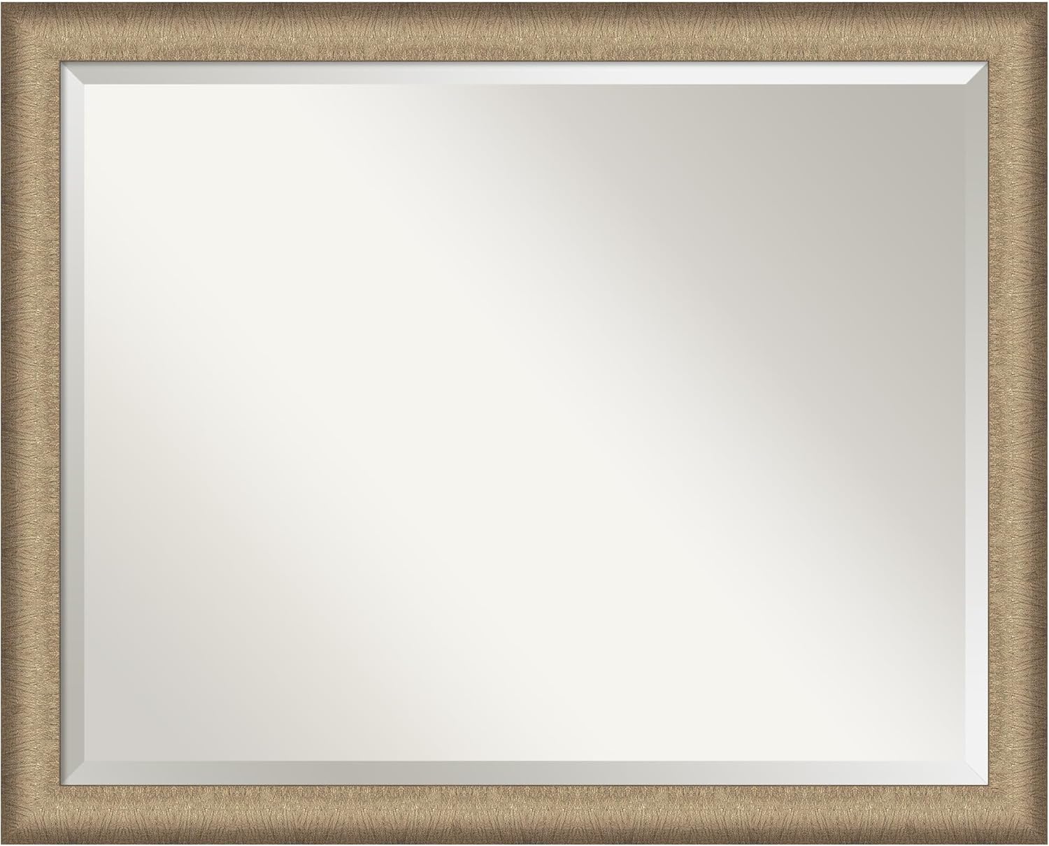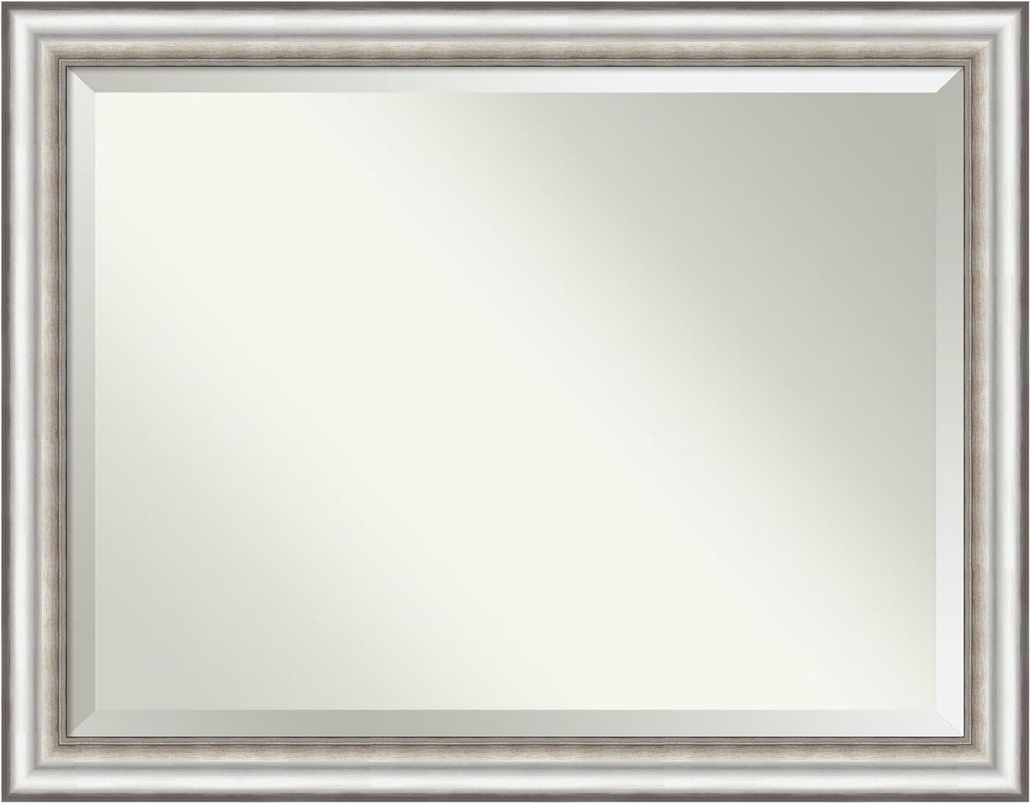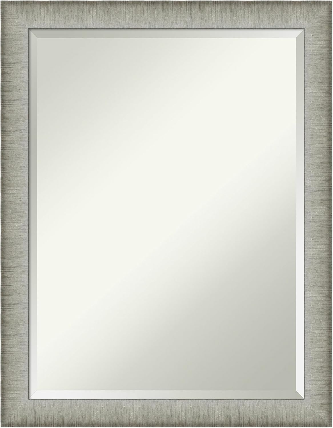 PRODUCT: Amanti Art Beveled Bathroom Wall Mirror; OUTER SIZE: 33 x 27 inches; FRAME: Crackled Metallic; FRAME FINISH: Distressed; FRAME COLOR: Silver. The Crackled Metallic frame is a distressed silver and champagne panel frame with a raised outer edge and neutral metallic, crackle-like finish. Give your bathroom the finishing touch with this framed wall mirror. Individually made using traditional custom framing techniques, it has the quality you would expect from your local frame shop. It holds its value with premium finishing that can be appreciated up close. Because of our attention to detail and focus on artistry, architects, interior designers, and homeowners alike choose this mirror to create beautiful living spaces.