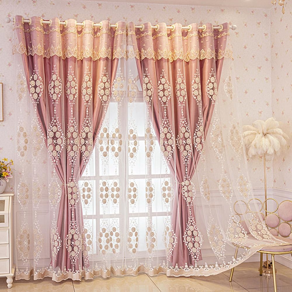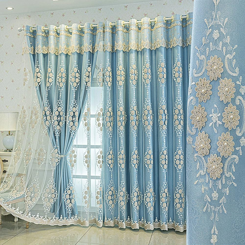 Features: Double layered curtains design, with one layer of solid color fabric curtains and another layer of embroidered sheer curtains, combining shading and aesthetics. The European style embroidery has improved the quality of the product.