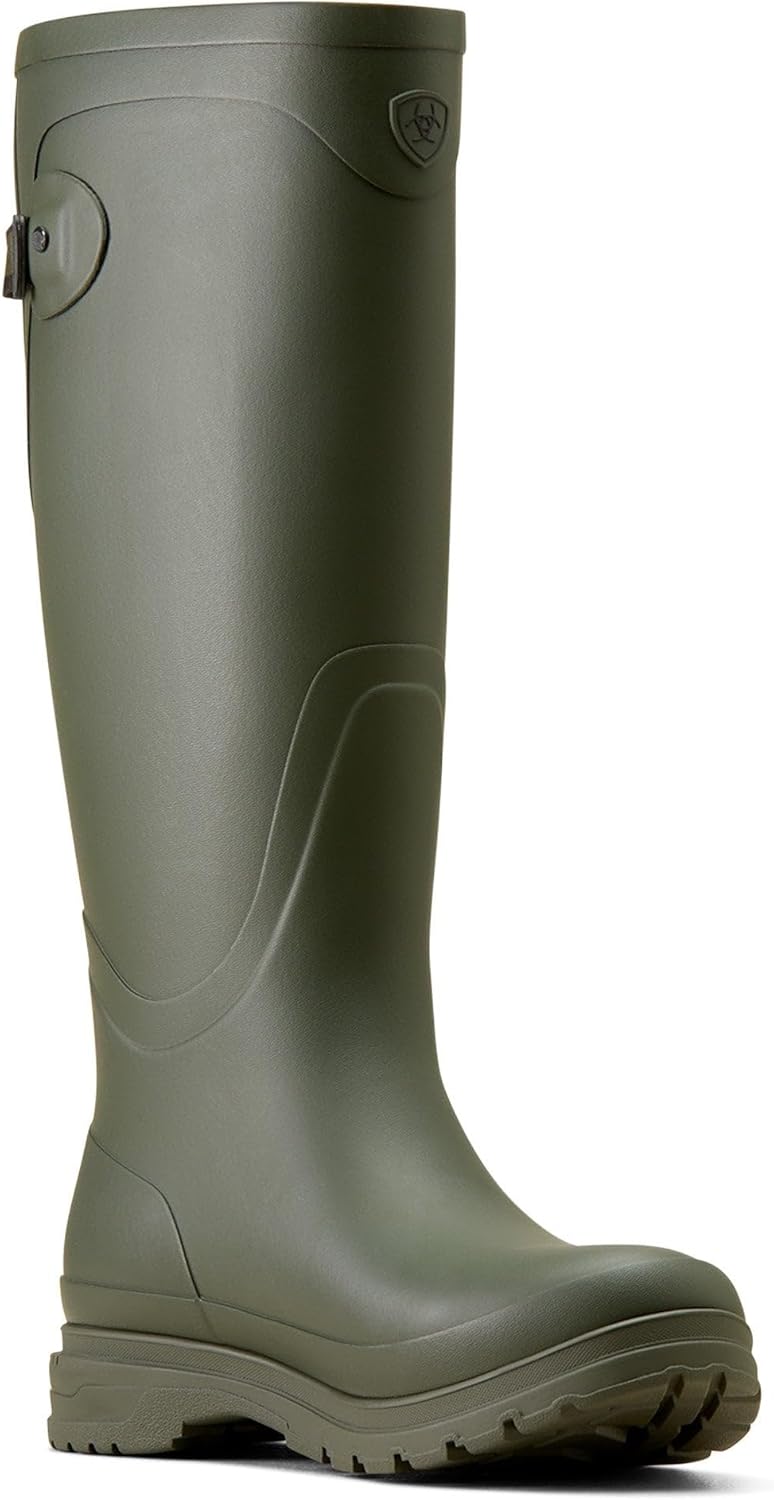 Featuring 4LR technology that provides maximum support and cushioning, the Ariat Kelmarsh Rubber Boots are perfect for your everyday wear. The waterproof rubber construction of these boots offers added protection. These rubber boots come with an adjustable back closure and an easy-off heel-kick design that offers a secure fit and ensures easy on and off. An ideal choice for your outdoor rides, these tall boots keep your feet dry and comfortable all day. Vulcanized rubber upper. Contoured, all-day cushioning insole and rubber lining. Convenient pull-on style. Brand detailing on the top. Round toe. Duratread outsole offers superior flexibility and wear resistance. Style 10050903