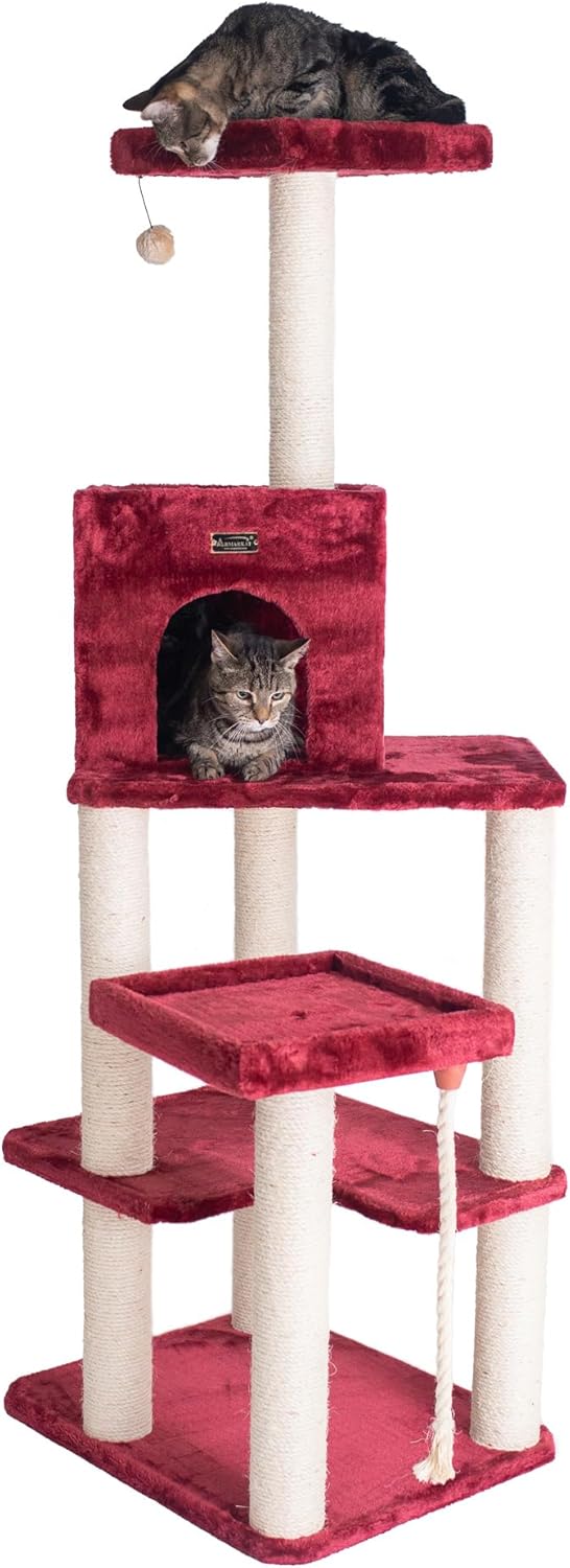 Armarkat model no. A6902B features a thick swinging sisal rope toy, hanging ball toy, playhouse, multiple perches and scratching posts for your cats to enjoy. F and B Bullet: 69" height, burgundy with high density and ultra-thick faux fur covering for felines comfort and soft, coverings are permanently adhered to wood structures. Well constructed of 15mm pressed wood material, making it not only thicker but stronger. 100% Natural, seasoned sisal rope wraps all posts securely for years of scratching. Dimensions:post diameter: 3.5"; base: 24" x 20"; playhouse: 15"(W) x 12"(H); perch: 14" x 14"; Max holding weight: 40 lbs. Six-months warranty included. Replacement parts available from manufacturer.
