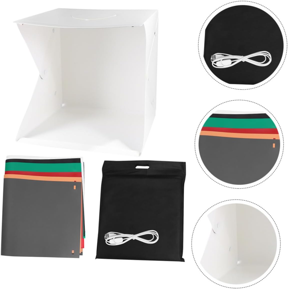 Package Include 1 x portable photography tent 1 x stepless dimming USB cable 2 strips 1 x carry bag 1 x black background 1 x white background 1 x red background 1 x green background 1 x background 1 x yellow background Characteristics - Color: White Photography Backdrop. - Size: About 40x40x40cm/15.72x15.72x15.72inch Photography Backdrops. - Material: PVC, Polyester, LED and Metal. - Built-in LED light, providing average light and prevents shadows and reflections in your photos Lighting Cube Tent. - Just need few minute to assemble your own photo anywhere, unfold this LED to get the backdrop for small item Mini Photography . - Made of material for durable and practical use Mini Tent. - Coming with folding design, more convenient to install and carry. - The allows quick and easy of small products such as shoes, , watches, gadgets and other items.Goods InformationMini Photography This item is a professional mini photo tent kit, coming with folding design, more convenient to install and carry, built-in LED light, providing average light and prevents shadows and reflections in your photos