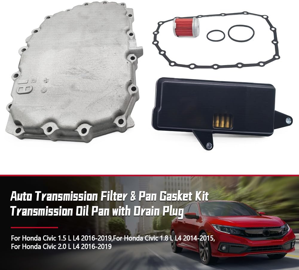 Please carefully confirm the model before purchasing Transmission Oil Pan with Drain Plug OE Part Number: 21151-R3W-000 21151R3W000 Auto Transmission Filter & Pan Gasket Kit OE Part Number: 21814-5T0-000 25420-5T0-003 25450-P4V-013 Packaging List: 1Pcs*Transmission Oil Pan with Drain Plug 1Pcs*Auto Transmission Filter & Pan Gasket Kit Compatibility: Fit for Honda Civic 1.5 L L4 2016-2019 Fit for Honda Civic 1.8 L L4 2014-2015 Fit for Honda Civic 2.0 L L4 2016-2019 Easy Installation: The oil pan gasket kit is designed to perfectly match the oil pan. During installation, it can be easily attached without any problems such as loose installation or non-adhesion.