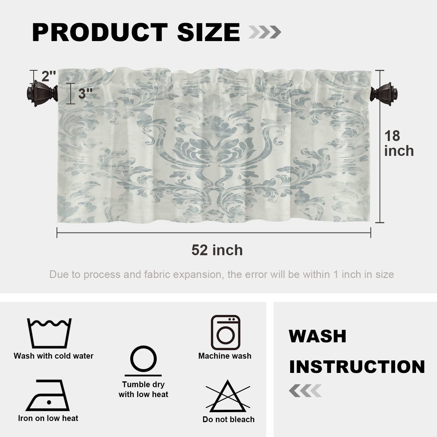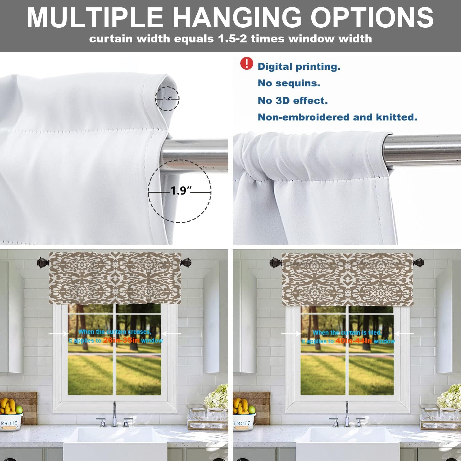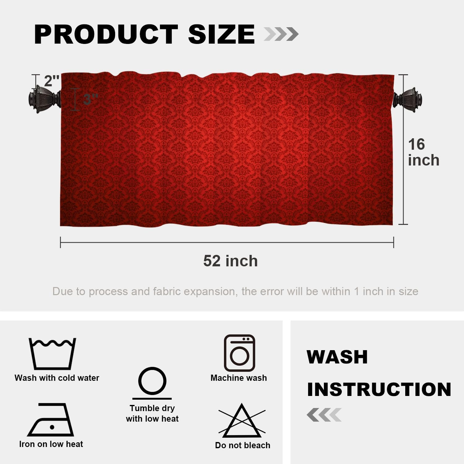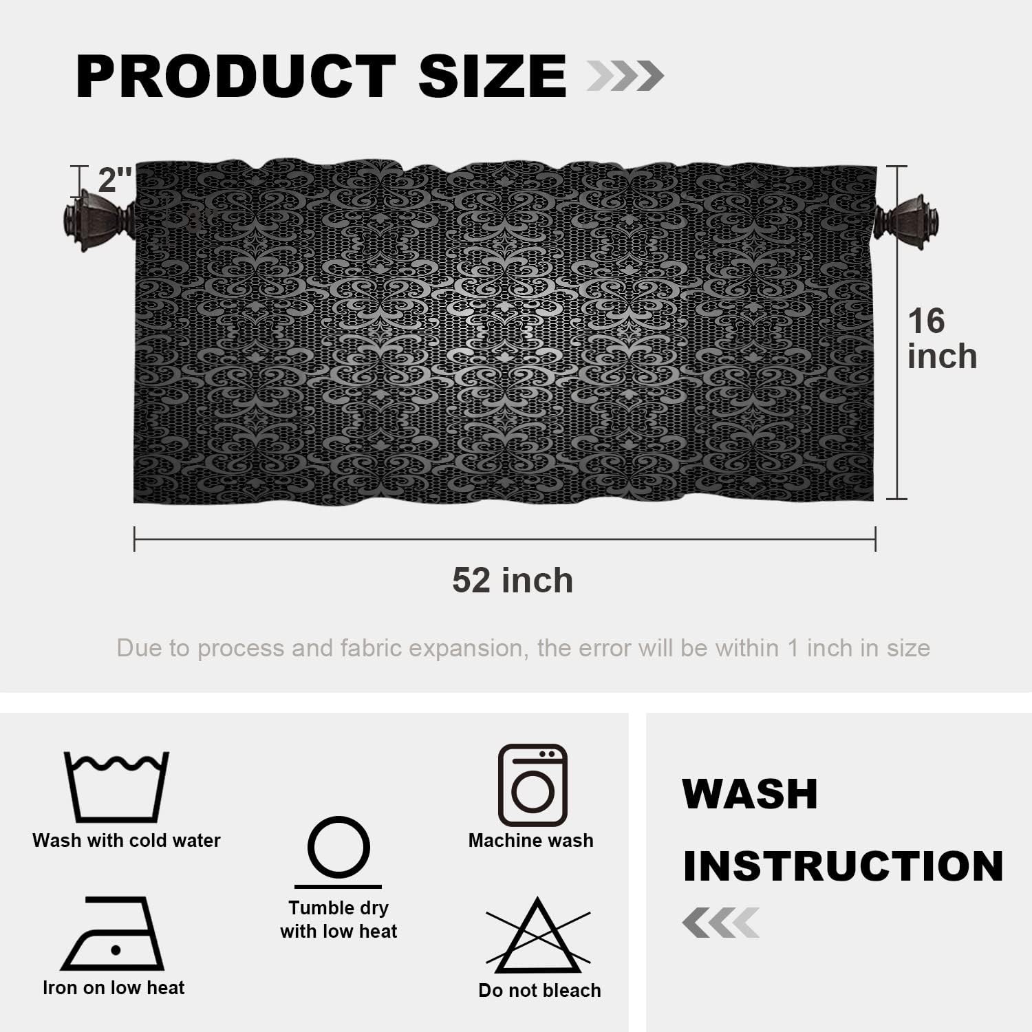 Batmerry valanceGreat picture,vivid colors and characteristic pattern design will make your room warm, pretty and unique look.Quality Material:High quality polyester,its softness makes curtains more exquisite.This curtain valance will not look very heavy, the wind can gently blow yarn, in winter can also penetrate the sun, very warm, even in summer can also add a layer of curtains to block the strong sun.Size:52x18 inch set of 1;52x18 inch set of 2 ; 52x16 inch set of 2.including 2 inch header and 3 inch rod pocket.40-44 inch long windows are suitable for decoration after the curtain is straightened, and 26-35 inch long windows are suitable for decoration after the curtain is pleatedMultiple Functions:These sheer curtain panels are suitable for kitchen, cafe room, bathroom, laundry room & studio etc.They can hang alone or match with other curtains.Easy Care:Machine washable for easy care, use only non-chlorine bleach when needed, tumble dry low and warm iron as needed.Warm Tips: Measure your pole and window size before you choosing curtains.Due to manual measurement, please kindly allow 1-2 cm discrepancy.Quality Guarantee:If you have any issue upon receiving the item, please contact us immediately.We will respond within 24 hours and make sure your issue is well taken care of.