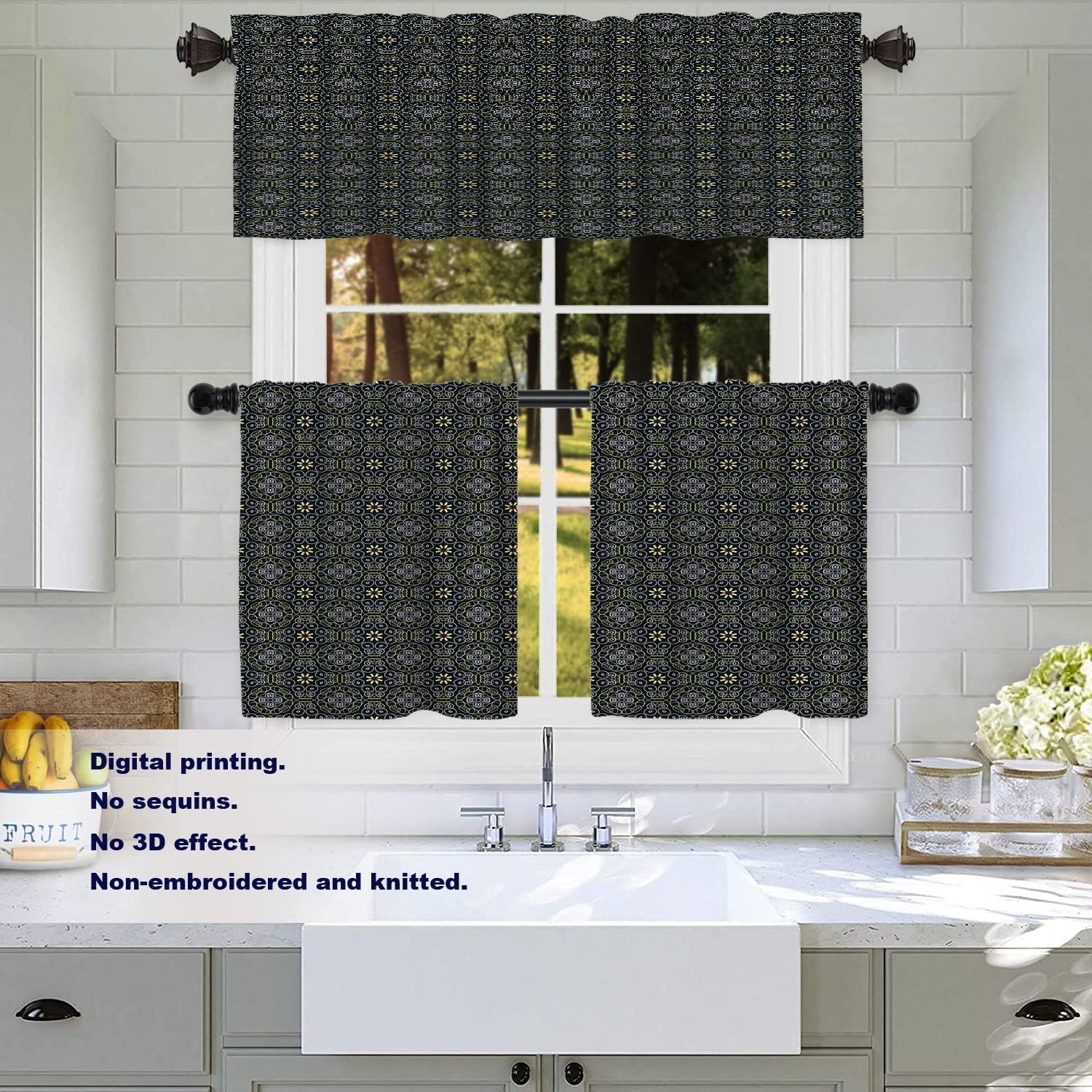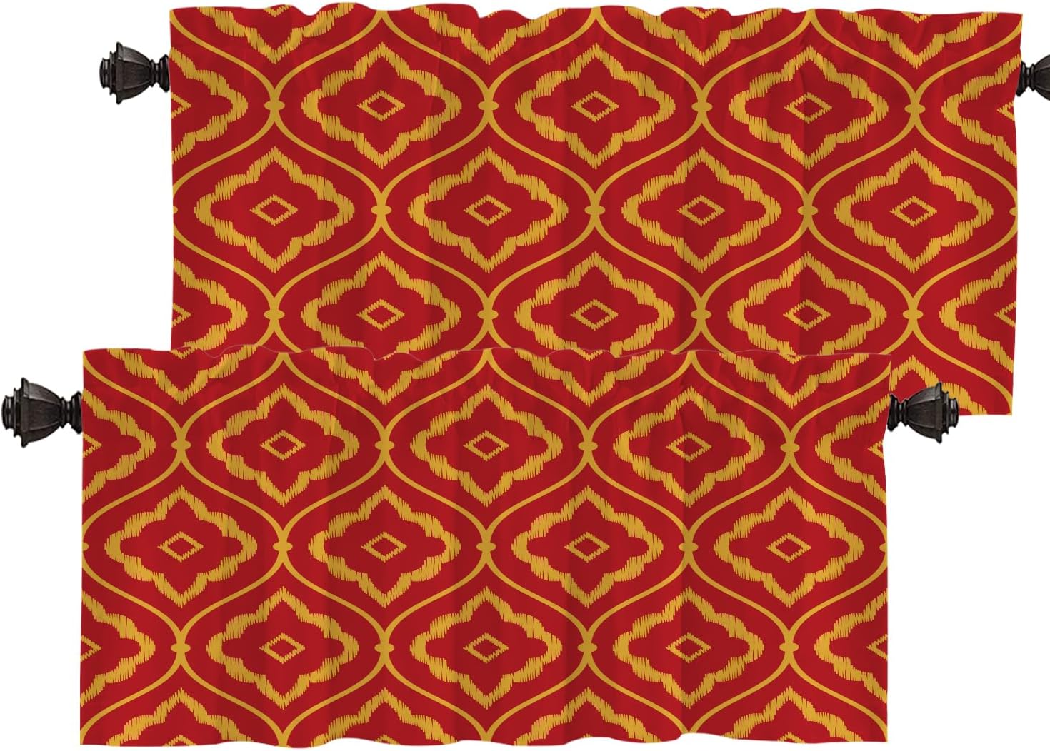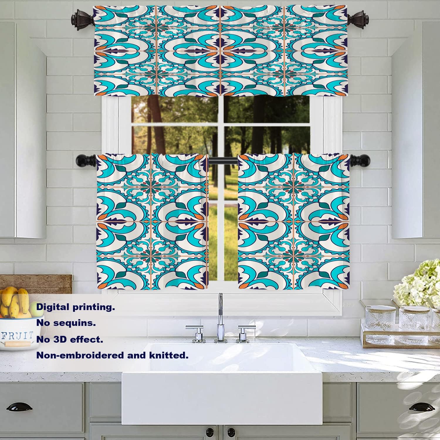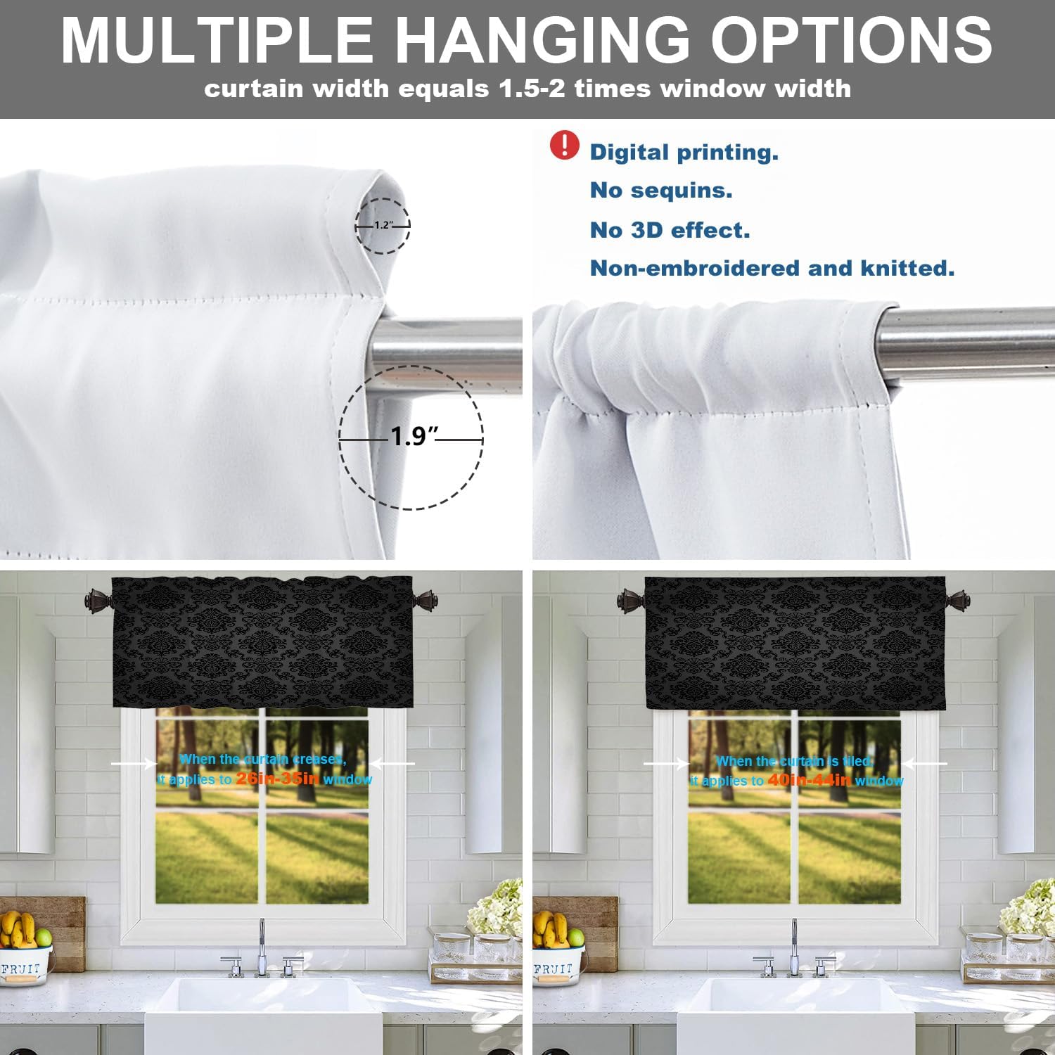 Batmerry valanceGreat picture,vivid colors and characteristic pattern design will make your room warm, pretty and unique look.Quality Material:High quality polyester,its softness makes curtains more exquisite.This curtain valance will not look very heavy, the wind can gently blow yarn, in winter can also penetrate the sun, very warm, even in summer can also add a layer of curtains to block the strong sun.Size:52x18 inch set of 1;52x18 inch set of 2 ; 52x16 inch set of 2.including 2 inch header and 3 inch rod pocket.40-44 inch long windows are suitable for decoration after the curtain is straightened, and 26-35 inch long windows are suitable for decoration after the curtain is pleatedMultiple Functions:These sheer curtain panels are suitable for kitchen, cafe room, bathroom, laundry room & studio etc.They can hang alone or match with other curtains.Easy Care:Machine washable for easy care, use only non-chlorine bleach when needed, tumble dry low and warm iron as needed.Warm Tips: Measure your pole and window size before you choosing curtains.Due to manual measurement, please kindly allow 1-2 cm discrepancy.Quality Guarantee:If you have any issue upon receiving the item, please contact us immediately.We will respond within 24 hours and make sure your issue is well taken care of.