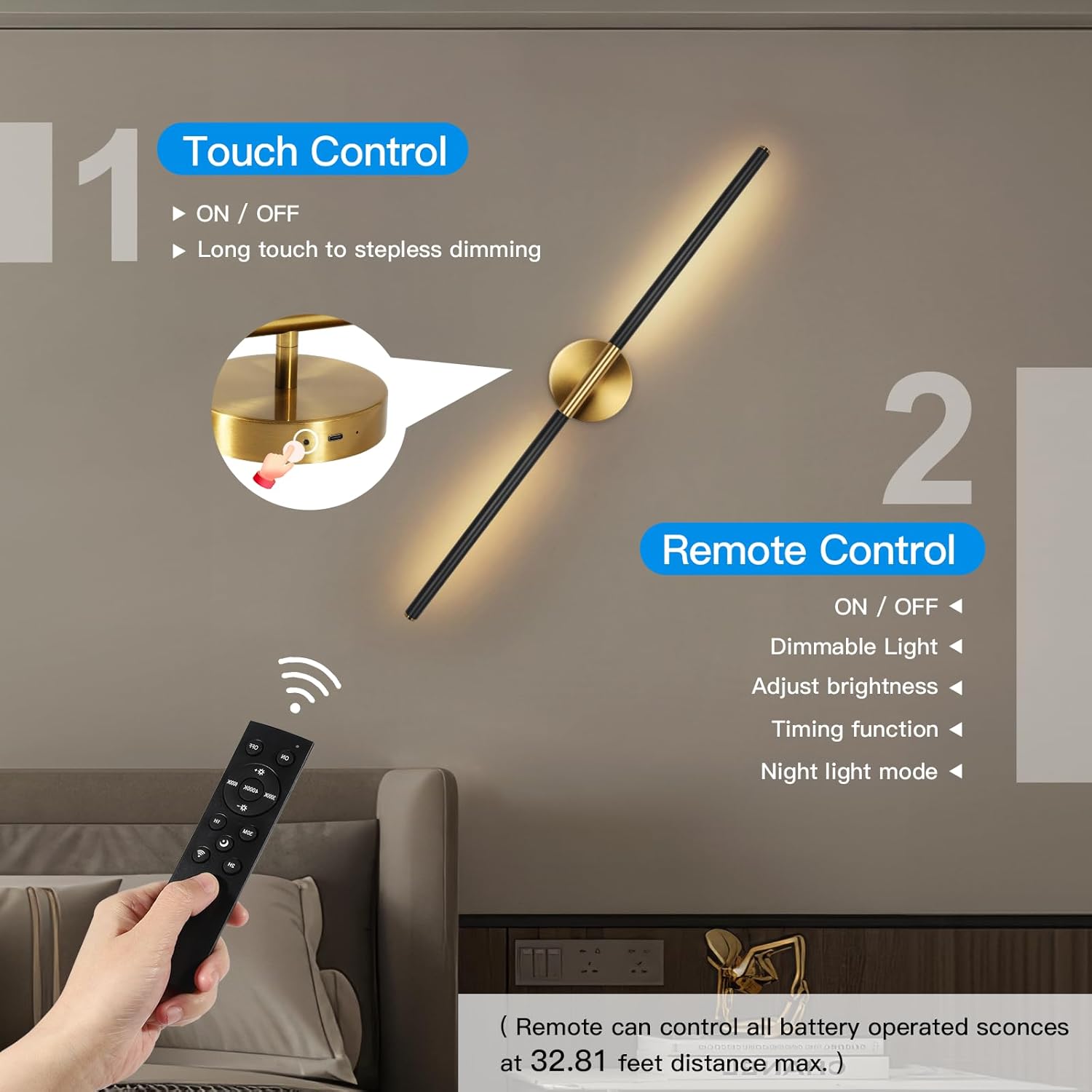 | Included Components | 1 x Instruction manual, 2 x Battery operated wall sconces, 2 x Mounting accessories, 2 x Remote, 2 x USB charging cables |