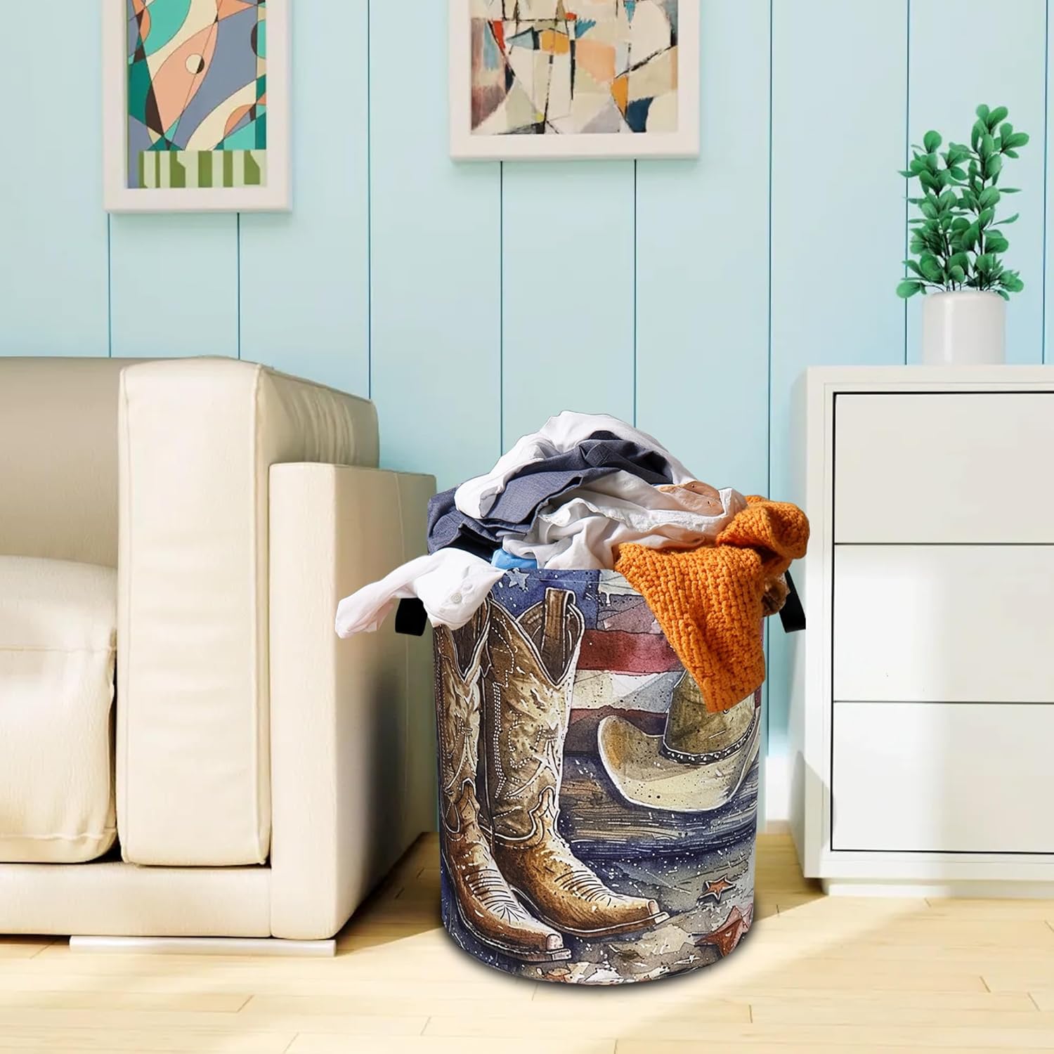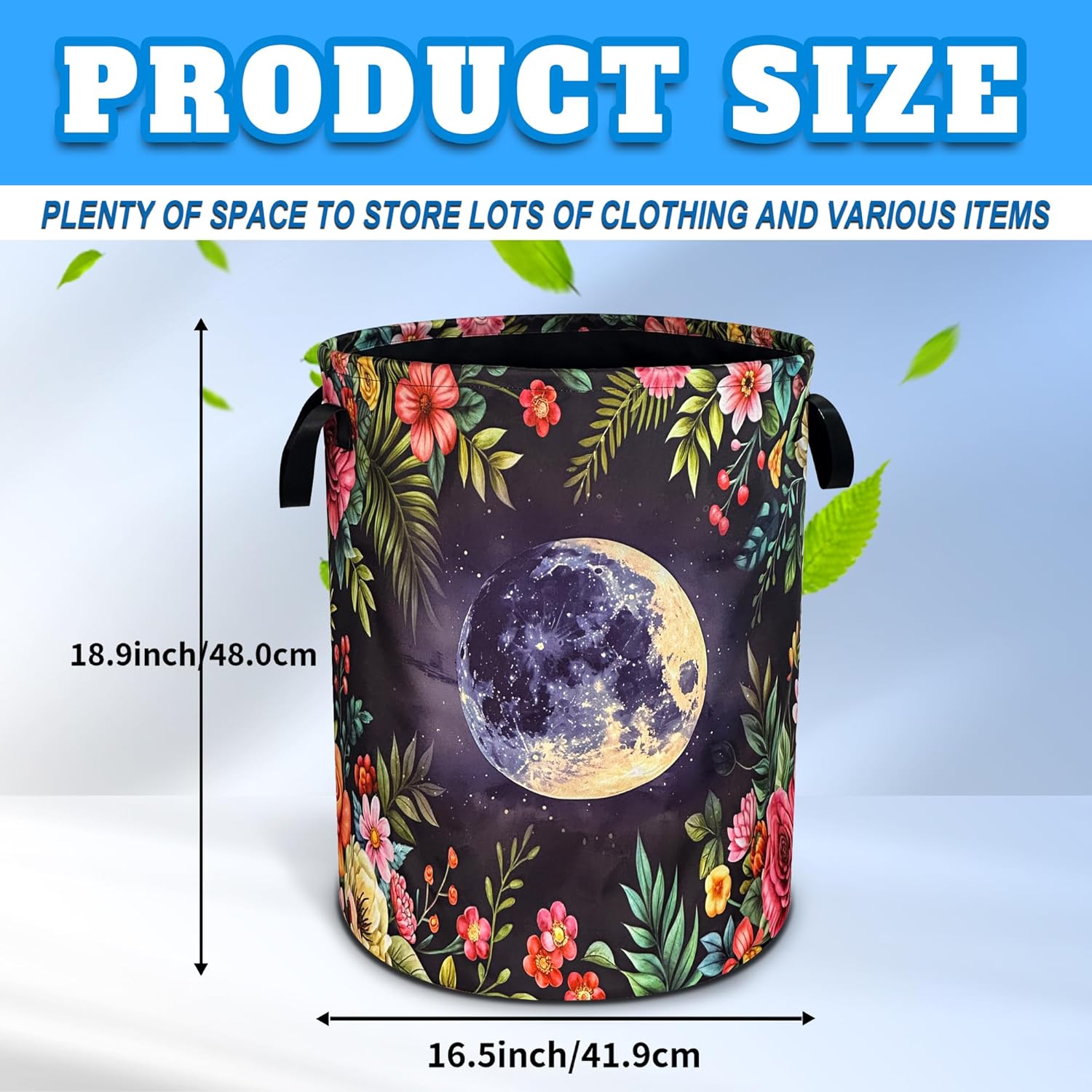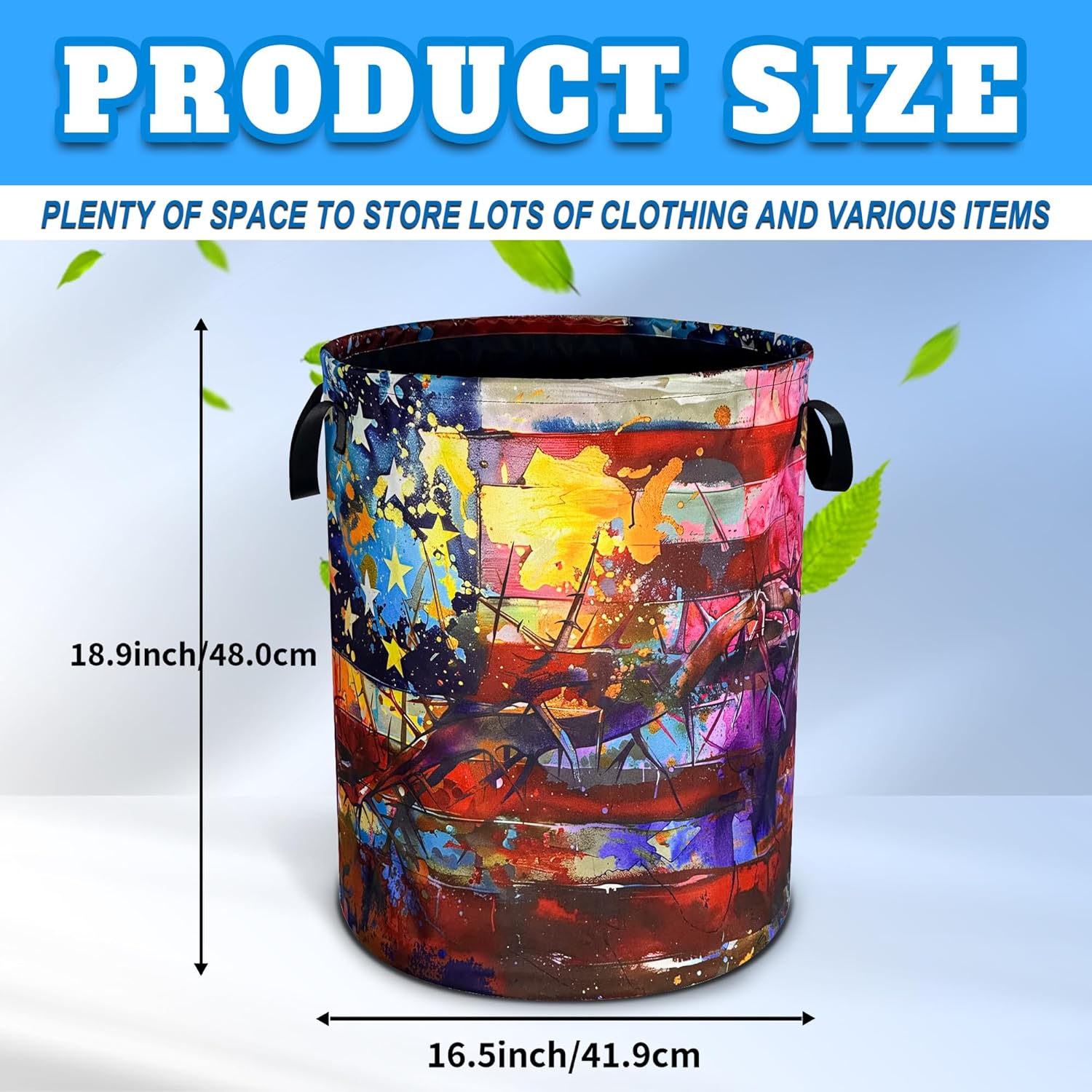 OXFORD CLOTH FABRIC: Lined, lightweight and portable, the material easy to clean, just wipe with a damp cloth or hand wash as needed.COMFORTABLE REINFORCED HANDLE: easy to grip, easy to carry, and more durable.LARGE CAPACITY: size 18.9 inches/48 cm (height) x 16.5 inches/41 cm (diameter). There is enough space to store a lot of clothes and store various items. Add a touch of art and functionality to your home with our eye-catching laundry basket!FOLDABLE: When not in use, our laundry basket can be folded to save space and easy to store, perfect for people with busy lives.WHY CHOOSE OUR LAUNDRY BASKET?Our Laundry Basket Is More Than Just A Storage Solution. It Is A Stylish Piece That Combines Artistic Beauty With Daily Practicality. Make Organization A Breeze!MULTI-PURPOSE BASKET: In addition to laundry, it is also very suitable for storing toys, books, blankets or other items. It has a wide range of uses, keeping your living environment clean, beautiful and tidy. It is a multi-functional product. The artistic design laundry basket is a good choice for bathrooms, bedrooms, laundry rooms, children's rooms, dormitories and other places.