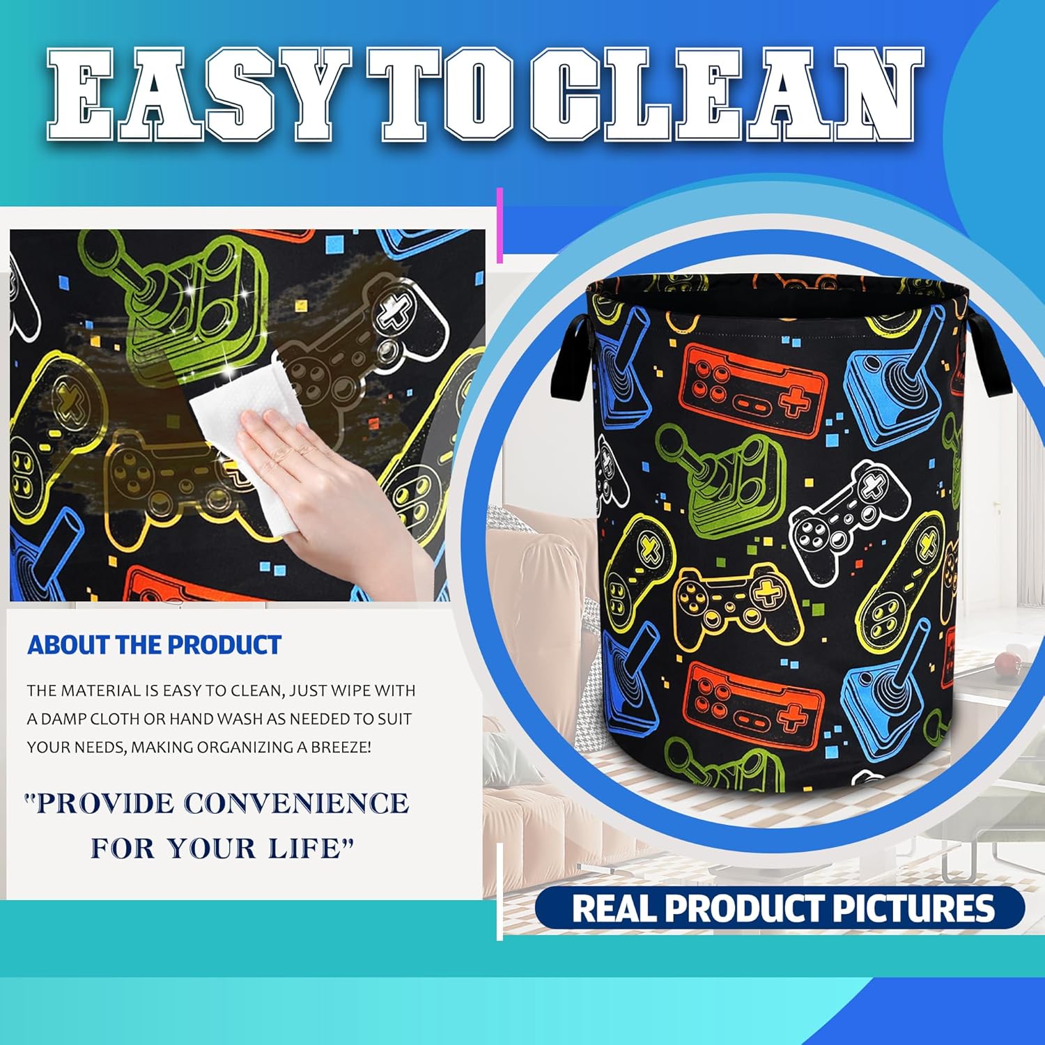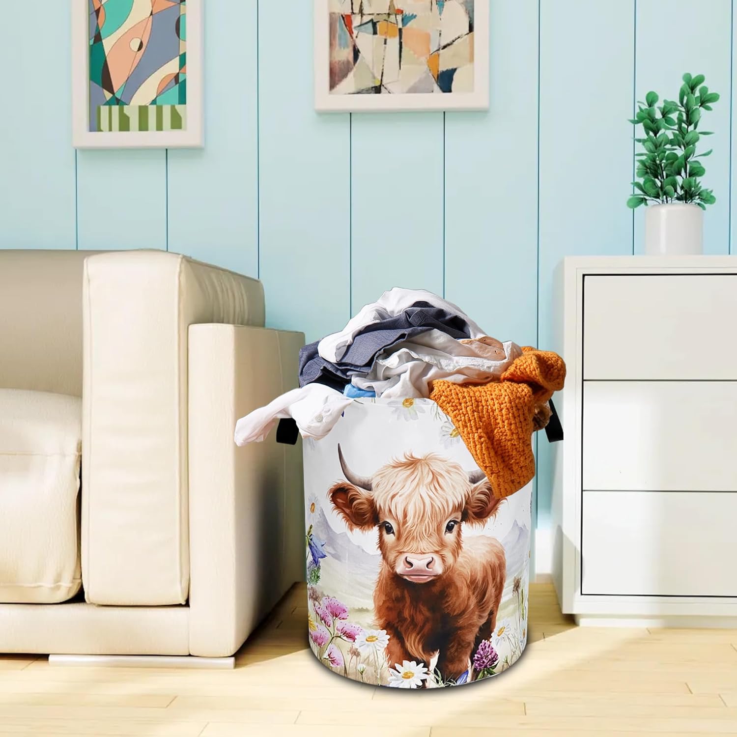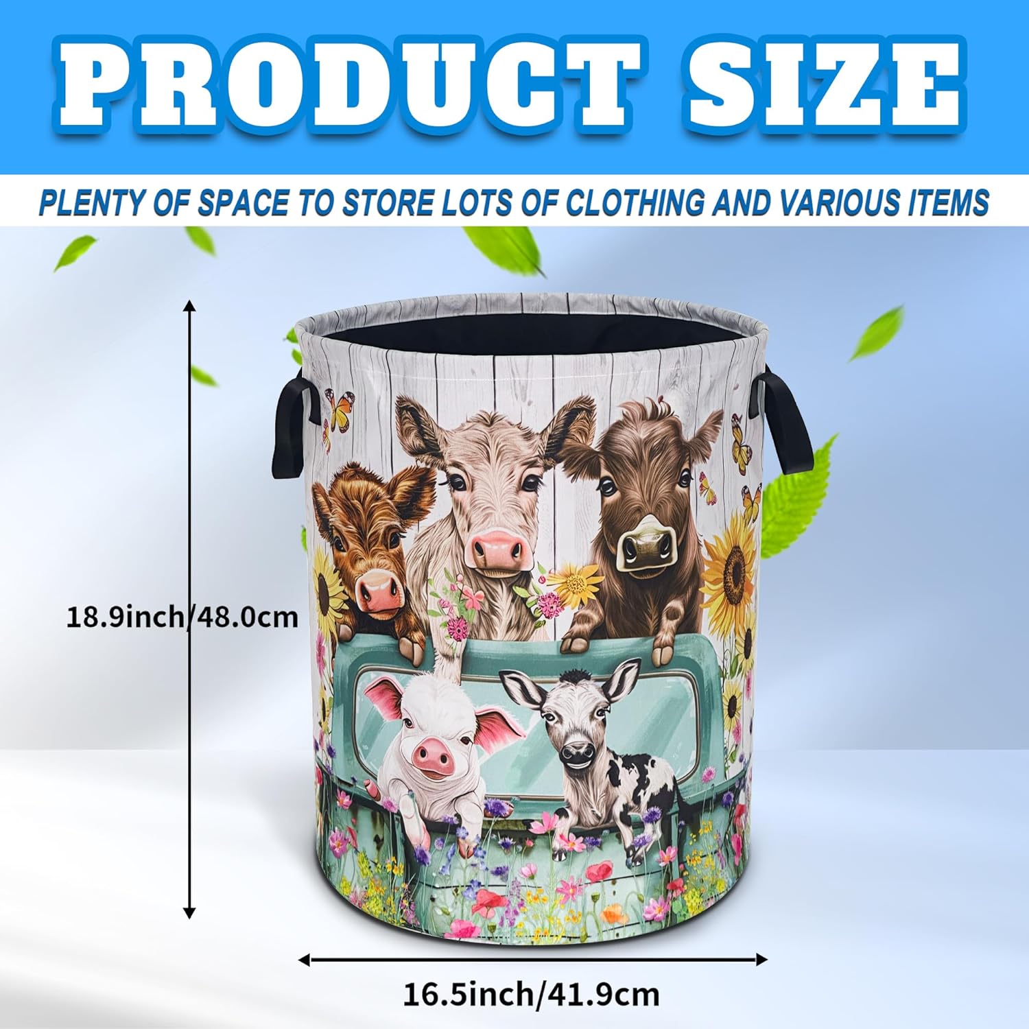 OXFORD CLOTH FABRIC: Lined, lightweight and portable, the material easy to clean, just wipe with a damp cloth or hand wash as needed.COMFORTABLE REINFORCED HANDLE: easy to grip, easy to carry, and more durable.LARGE CAPACITY: size 18.9 inches/48 cm (height) x 16.5 inches/41 cm (diameter). There is enough space to store a lot of clothes and store various items. Add a touch of art and functionality to your home with our eye-catching laundry basket!FOLDABLE: When not in use, our laundry basket can be folded to save space and easy to store, perfect for people with busy lives.WHY CHOOSE OUR LAUNDRY BASKET?Our Laundry Basket Is More Than Just A Storage Solution. It Is A Stylish Piece That Combines Artistic Beauty With Daily Practicality. Make Organization A Breeze!MULTI-PURPOSE BASKET: In addition to laundry, it is also very suitable for storing toys, books, blankets or other items. It has a wide range of uses, keeping your living environment clean, beautiful and tidy. It is a multi-functional product. The artistic design laundry basket is a good choice for bathrooms, bedrooms, laundry rooms, children's rooms, dormitories and other places.