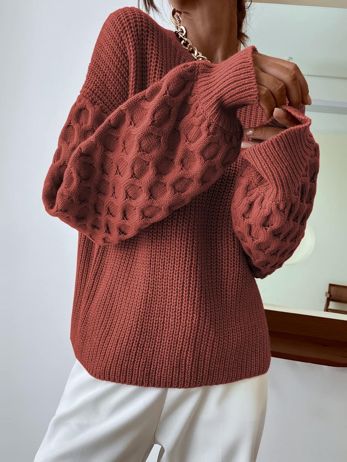 XSBicep Length : 14 inchBust : 38.6 inchCuff : 5.9 inchLength : 19.7 inchShoulder : 20.1 inchSleeve Length : 19.9 inchSBicep Length : 14.6 inchBust : 40.2 inchCuff : 6.3 inchLength : 20.1 inchShoulder : 20.9 inchSleeve Length : 20.1 inchMBicep Length : 15.2 inchBust : 41.7 inchCuff : 6.7 inchLength : 20.5 inchShoulder : 21.7 inchSleeve Length : 20.3 inchLBicep Length : 16 inchBust : 44.1 inchCuff : 7.3 inchLength : 21.1 inchShoulder : 22.8 inchSleeve Length : 20.6 inchXLBicep Length : 16.9 inchBust : 46.5 inchCuff : 7.9 inchLength : 21.7 inchShoulder : 24 inchSleeve Length : 20.9 inchXXLBicep Length : 17.8 inchBust : 48.8 inchCuff : 8.5 inchLength : 22.2 inchShoulder : 25.2 inchSleeve Length : 21.2 inchColor: Dusty Pink,Hot Pink,Green,Apricot,Rust Brown,Redwood,Teal Blue,Burgundy,BlackStyle: CasualPattern Type: PlainType: PulloversNeckline: Round NeckSleeve Length: Long SleeveSleeve Type: Bishop SleeveLength: RegularFit Type: Regular FitFabric: Slight StretchMaterial: AcrylicComposition: 100% AcrylicCare Instructions: Machine wash or professional dry cleanSheer: No