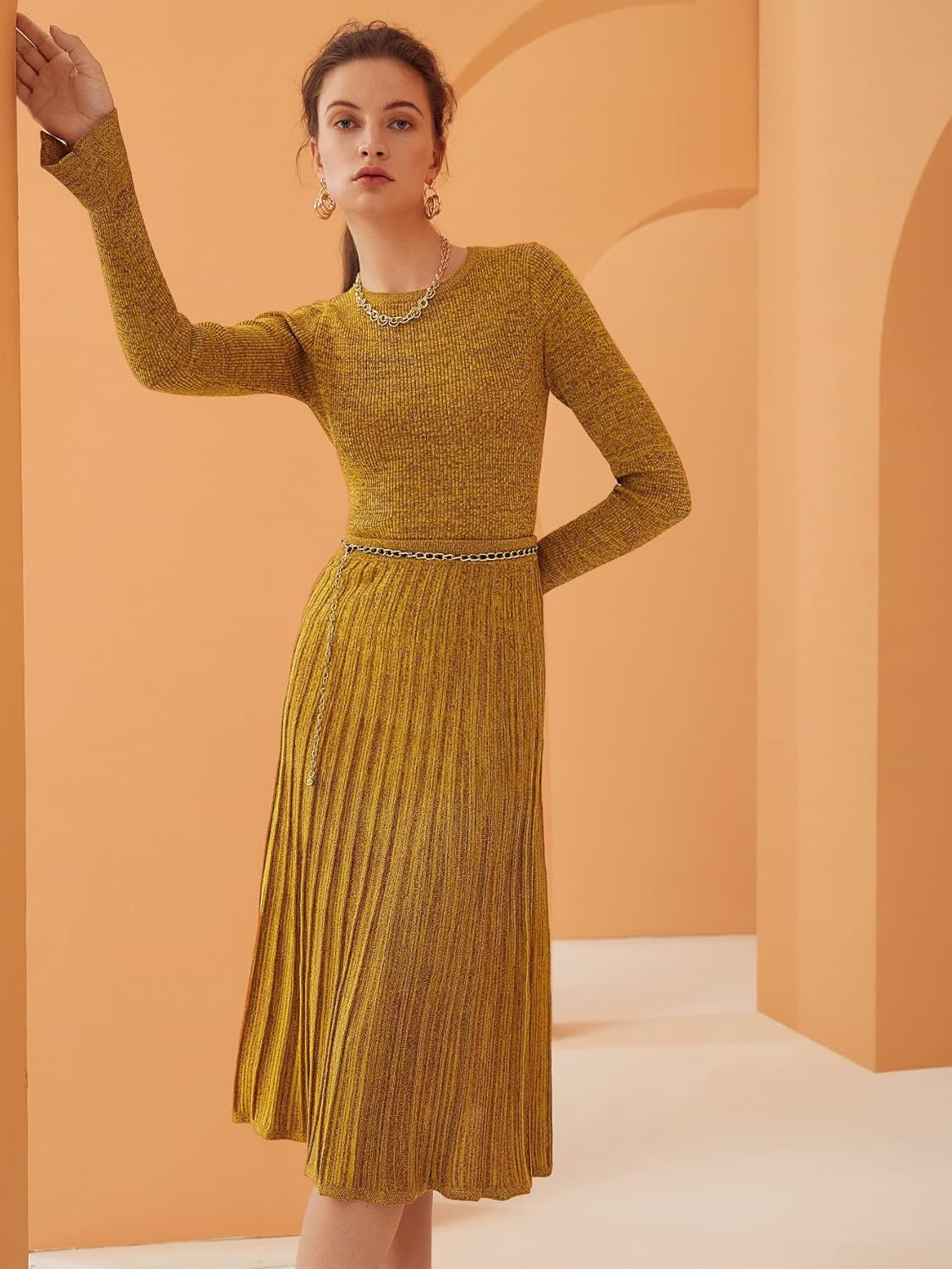 SBust : 22.8 inchCuff : 11 inchLength : 20.5 inchShoulder : 10.6 inchSleeve Length : 26 inchMBust : 24.4 inchCuff : 11.8 inchLength : 21.3 inchShoulder : 11 inchSleeve Length : 26.4 inchLBust : 26 inchCuff : 12.6 inchLength : 22 inchShoulder : 11.4 inchSleeve Length : 26.8 inchColor: Mustard YellowStyle: CasualPattern Type: PlainType: PulloversNeckline: Round NeckSleeve Length: Long SleeveSleeve Type: Regular SleeveLength: CropFit Type: Slim FitFabric: Medium StretchMaterial: PolyesterComposition: 100% PolyesterCare Instructions: Machine wash or professional dry cleanSheer: No