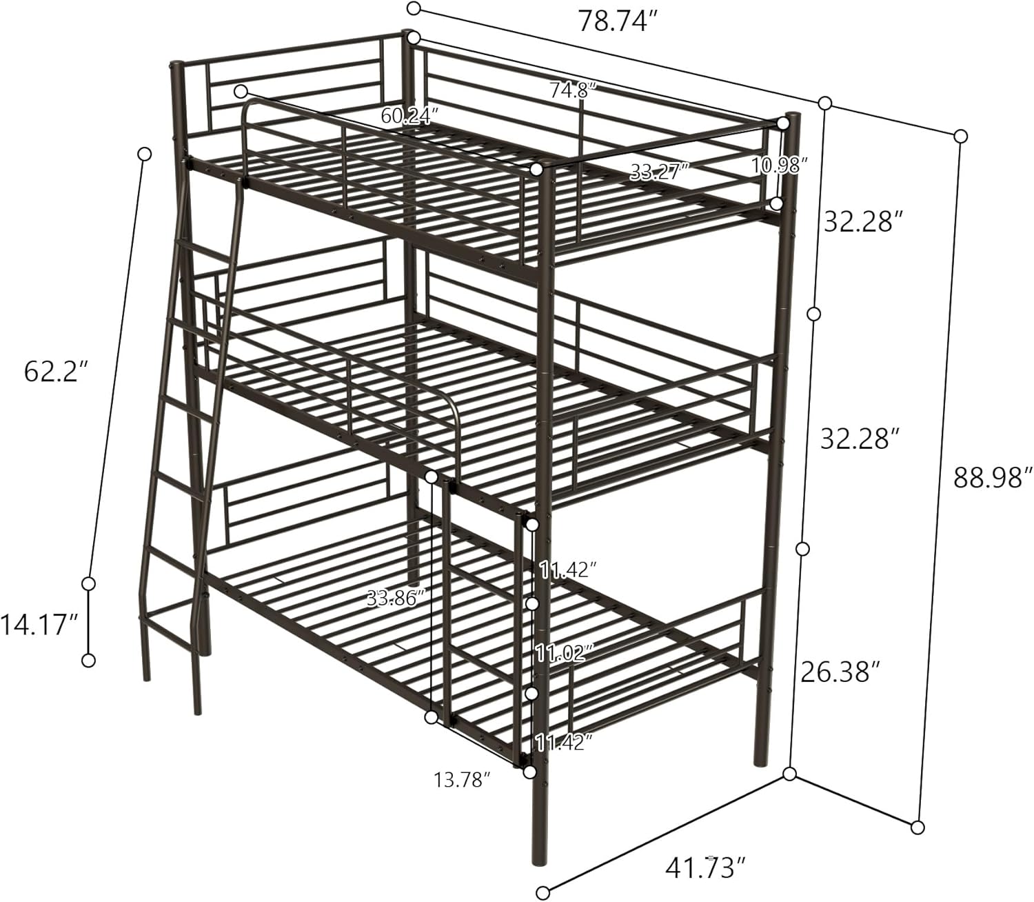 [Saving Space] This three-story bed makes full use of vertical space and saves enough space for other furniture in the children's bedroom. When you need a single bed, it can be split into three single beds. It can also be split into bunk beds and single beds, making it ideal for families with many children or guests who spontaneously spend the night. [Multifunctional triple bunk bed] This triple bunk bed is ideal for families with multiple members. The two-decker design saves space, and two ladders are installed on the bed for easy access to the top and middle beds. The three stacked beds are made of heavy metal and are safe, strong and stable. [Premium Three-tiered Bed] The three-tiered bed is made of heavy steel and provides strong support. Equipped with easy-to-use metal guardrails to keep your child comfortable and safe. It is securely strong and stable. Therefore, it can withstand the test of time and will not make any noise or shaking after many years. Each bed has 20 fixed metal rib strips that provide strong support, allowing each bed to withstand a weight of up to 350 pounds without the need for box springs. [Industrial Style] The twin bed/twin bed/full bed board is made of high-quality steel. It is not only durable, but also has no chemical smell. It is the first choice for healthy living. [Easy Assembly] This elegant three-story bunk bed comes with clear instructions that will guide you through all the steps. Each section is numbered and has a clear manual, and all tools are included so there is no need to worry about installation. Overall size of the product: 78.74''L* 41.73'W * 89.98'H (internal size), weight and capacity: upper bed-250 pounds, middle bed-300 pounds, lower bed-330 pounds.