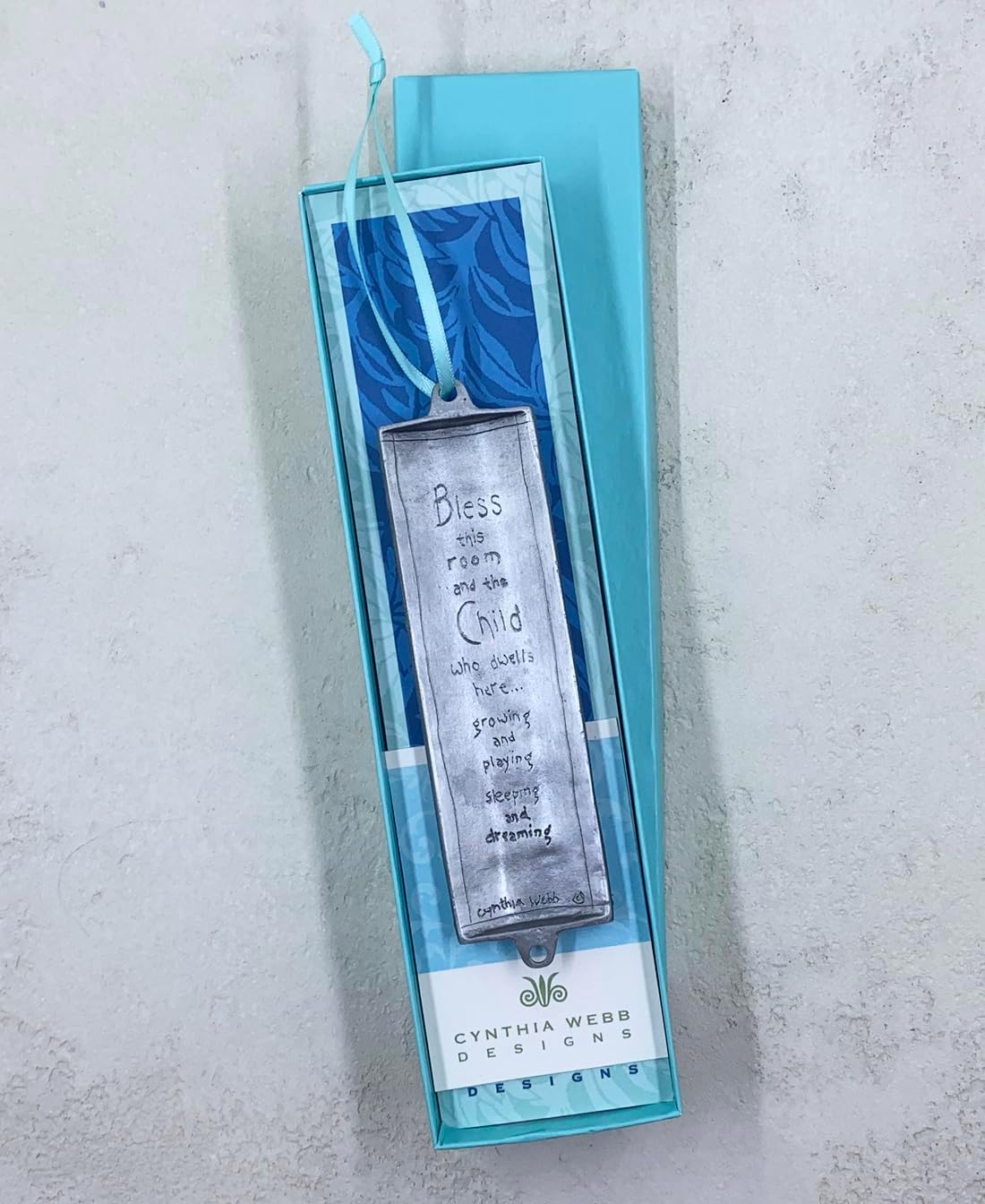 Bless this Room and the Child who dwells here... growing and playing, sleeping and dreaming. Adapted from the wonderful tradition of Mezuzahs, in which a blessing is placed on each doorpost in a home. Our adaptation can be used as a Mezuzah cover, or as a decorative piece as a reminder of our many blessings…to hang on the wall, by a light switch, on a door jamb, over a bed, anywhere a special blessing is appreciated…Gift boxed with hanging ribbon, and descriptive story/instruction card. 1 1/4 wide x 5" high (the body of the piece is the same height as a light switch)