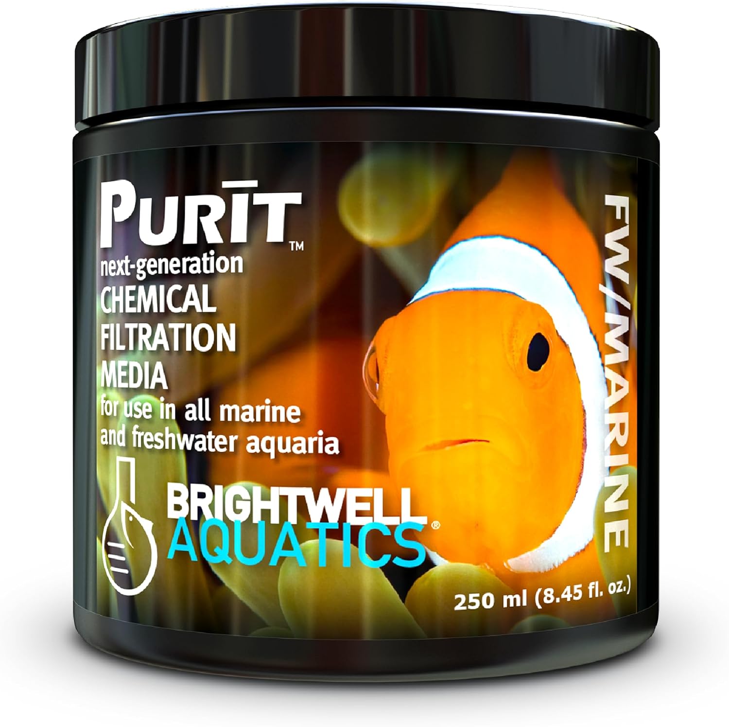 Brightwell Aquatics Purit Next-Generation Chemical Filtration Media Experience a new level of aquarium care with Brightwell Aquatics Purit Next-Generation Chemical Filtration Media. It stands out with advanced filtration technology, combining enhanced activated carbon—surpassing traditional counterparts—with NSF-grade ion-exchange and adsorptive resins. This combination effectively removes a range of impurities, including chloramines, ammonia, heavy metals, and organic material. Beyond enhancing water quality, the treatment improves clarity by eliminating dyes and discoloration, eradicates odors from decaying organic matter, and removes copper, lead, and other heavy metals. Compatible with reef, mixed-reef, fish-only, community, and planted aquaria, Purit offers versatility. Available in sizes from 250ml to 20L, its long-lasting effectiveness, guided by precise application instructions, ensures sustained water quality improvement. The product's efficacy is maximized through suggested pre-filtering and adaptable application methods, with users advised to monitor signs of exhaustion for timely replacement. Purit emerges as a comprehensive solution, embodying advanced technology, compatibility, and effective water quality management for diverse aquarium setups. Whether you're setting up a new tank or maintaining an established one, choose the Purit Next-Generation Chemical Filtration Media for a meticulously crafted solution that supports the delicate cleaning required for the health and longevity of your marine aquarium. AMERICAN-MADE EXCELLENCE Trust in the quality and excellence of Brightwell Aquatics, an industry-leading brand committed to providing innovative and scientifically backed aquatic care products. Made in the USA, we consistently strive to deliver advanced superior quality solutions to elevate the vibrancy and health of your aquarium.