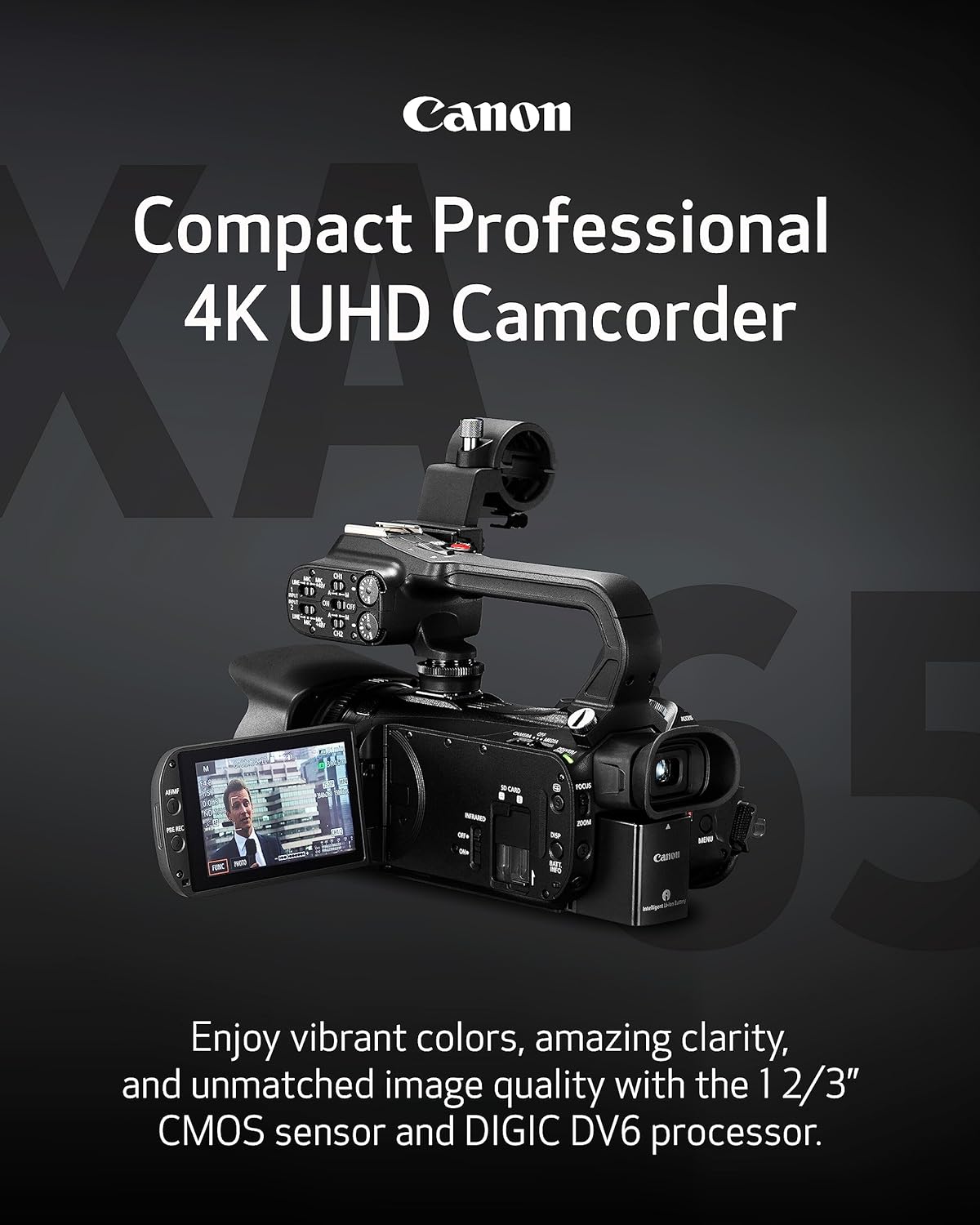 The Canon XA65 Pro Camcorder is a compact powerhouse that enables you to shoot, record, document, and stream high-quality 4K UHD videos with ease. Equipped with a 1/2.3" CMOS sensor and DIGIC DV6 processor, this Canon professional camcorder delivers stunning 4K UHD and Full HD images. The on-screen display (OSD) Time Stamp recording feature allows you to embed such data as date, time, and timecode into your videos, making it ideal for legal and law enforcement videographers. Enjoy professional audio control with two XLR terminals on the detachable handle and 4-channel linear PCM, which provide a variety of options for capturing high-quality sound. Get it all in frame, whether near or far thanks to a 4K 20x optical zoom lens that covers a wide magnification range, along with digital zoom that further extends it to 800x magnification, plus, experience fast, precise focusing with face detection. And with Canon's Dynamic IS 5-axis image stabilization, your footage remains steady and shake-free. Live stream your videos in HD directly from the Canon video camera to your PC or Mac via seamless USB Type-C output connectivity and UVC* support, while the 3.5" touchscreen LCD and tiltable OLED EVF make framing and monitoring a breeze. Choose between XF-AVC and MP4 recording formats for flexibility and recording in stunning 4K UHD 160Mbps at 30P/24P or Full HD 45Mbps at 60P/60i/30P/24P, as well as capture moments in fast or slow motion to achieve unique, high-speed effects. The Canon XA65 4K camcorder also offers professional input and output options, including 3G-SDI, dual SD card slots for backup and relay recording, and infrared mode. *USB-C cable required to connect to PC or Mac (Optional USB Cables IFC-400U, or IFC-150AB III not included). Audio output through USB is not supported.