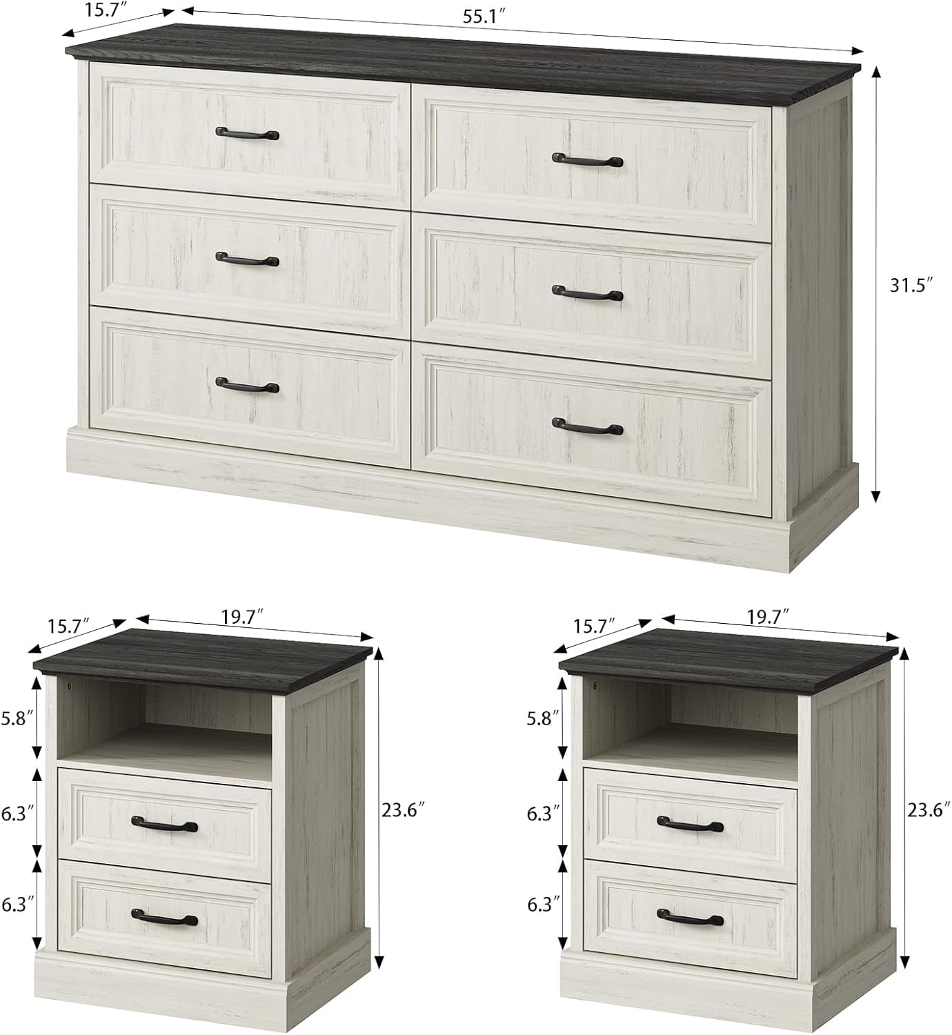 CARPETNAL Farmhouse Dresser and Nightstand Sets for Bedroom, 3 Pcs Bedroom Dresser Set, 6 Drawer Dresser & Nightstand Set of 2, Modern Wood Chest of Drawers for Bedroom, Living room, Entryway, White