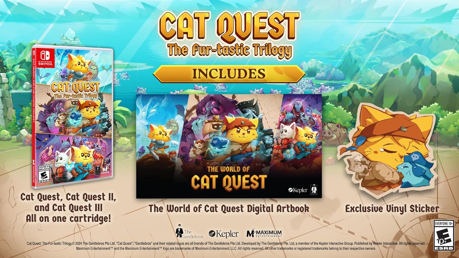 The Fur-tastic Trilogy contains three meow-nificent catventures in the Cat Quest Universe: Cat Quest, Cat Quest II, and Cat Quest III, as well as The World of Cat Quest Digital Artbook and an exclusive vinyl sticker to take a little bit of pawesome with you, wherever you go! The World of Cat Quest Digital Artbook provides a treasure trove of insights behind the art of the Cat Quest franchise, from initial idea conceptions pre-Cat Quest, all the way through to the paw-geous artistic creations of Cat Quest III! The multi award-winning Action RPG. Cat Quest's loot-fuelled cat-venture is as beautifully crafted, as its combat and magic are ultra-satisfying. Universally adored by critics - it'll have you purring for joy! Open-world action-RPG in a fantasy realm of cats and dogs. CAT QUEST II lets you play solo or with a friend, as both a cat and dog! Quest in a world filled with magic, defeat monsters and collect loot in a catventure like never before! In Cat Quest III you play as a purrivateer in a freely explorable 2.5D open-world swarming with Pi-rats. You can sail the seas in your ship for treasures galore! But prepare for peril, as the Pirate King aims to hunt you down…
