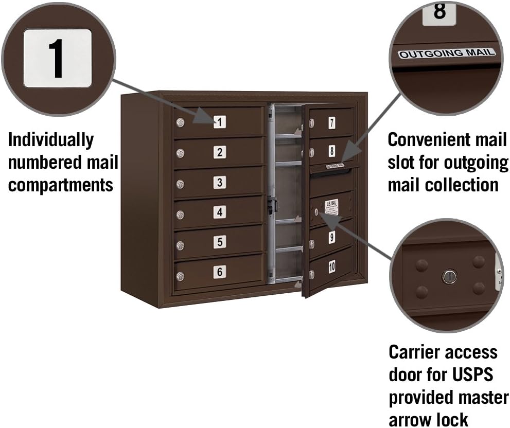 Made of heavy gauge aluminum and stainless steel hardware, Salsbury 3800 series surface mounted 4C horizontal mailboxes for U.S.P.S. Access are ideal for apartments, commercial buildings and residential developments. 4C horizontal mailboxes are accessed from the front through one or two easy opening master door panels. Surface mounted 4C horizontal mailboxes include a U.S.P.S. Approved 4C horizontal mailbox and matching surface mounted enclosure and are available in configurations that are one door wide (single column) and two doors wide (double column). the durable and corrosion resistant units feature a powder coated finish available in four contemporary colors. Surface mounted 4C horizontal mailboxes are available with 3 mailbox door sized. All doors are pre-numbered starting with 1, include a heady duty dust/rain shield and three keys. Surface mounted 4C horizontal mailboxes provide a convenient means of installing 4C horizontal mailboxes in locations where walls are not deep enough for a recessed mounted installation. U.S.P.S. Postal regulation require one parcel locker for every ten tenant compartment. Salsbury Industries is an ISO 9001:2015 certified company and has excelled in the field of manufacturing since 1936.
