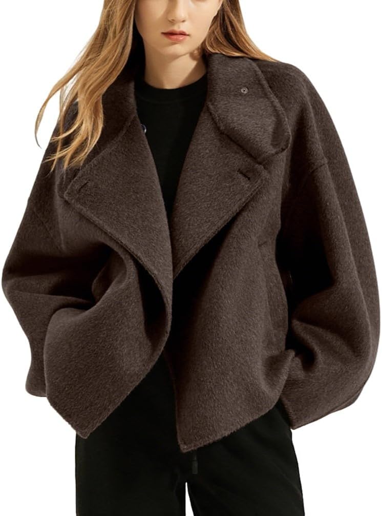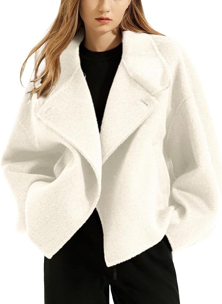 CHARTOU Women Wool Blend Pea Coat/ Notch Lapel Crop Casual Jacket/ Casual Loose Long Sleeve Short Overcoat Outwear/ Women Trendy 2025 Fall Winter Vacation Outfits/ Open Front Trench Coat