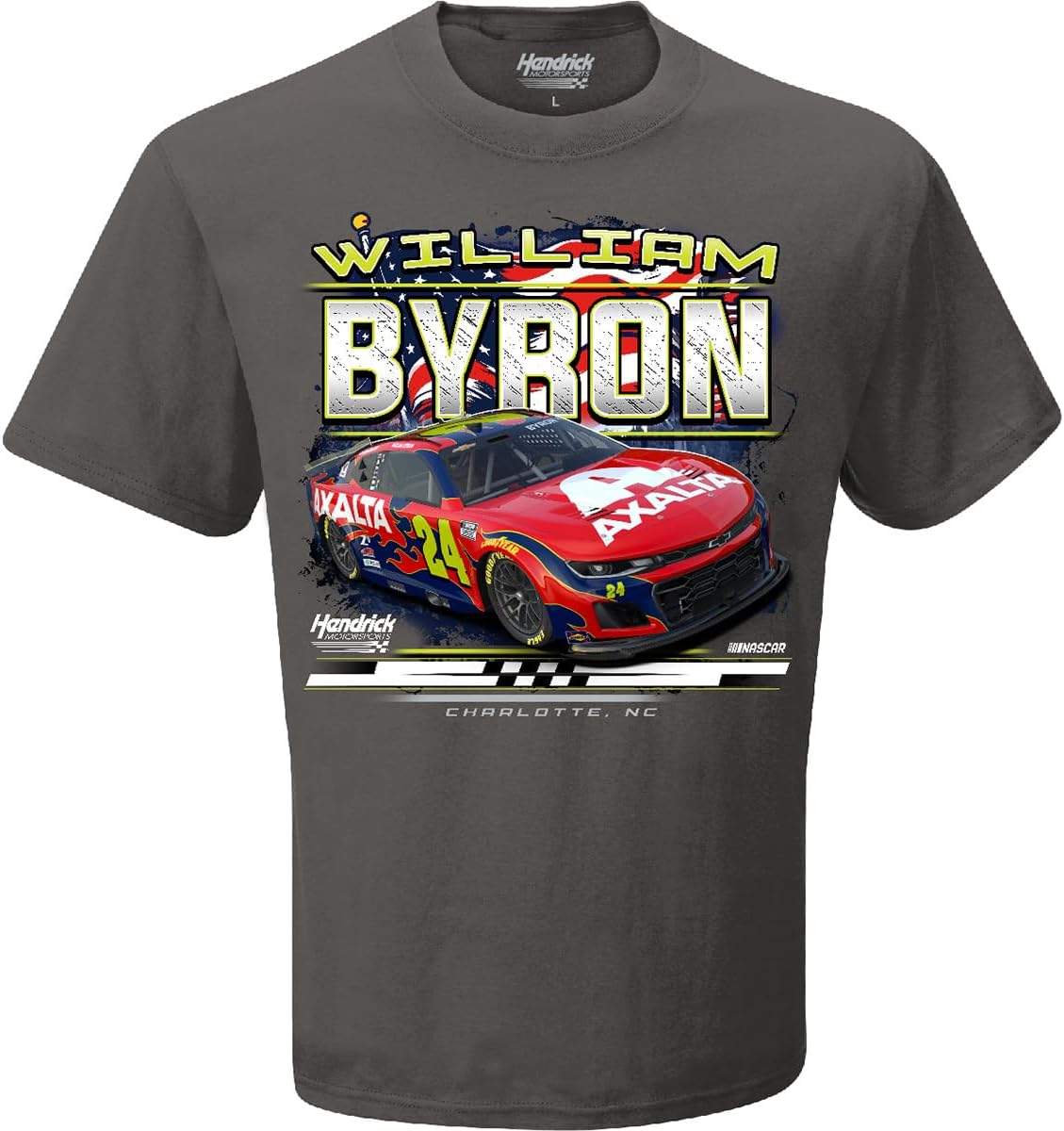 Show your NASCAR pride with this officially licensed William Byron t-shirt from Checkered Flag Sports. Featuring bold screen-printed graphics on both front and back, this gray t-shirt showcases Byron's iconic number 24, race car design, and patriotic American flag-inspired elements. The shirt displays the Axalta sponsorship, team logo, and NASCAR branding, along with 'Charlotte, NC' text. Made from 100% cotton for all-day comfort, this t-shirt offers a classic fit that's perfect for race day or casual wear. The striking design incorporates vibrant yellow accents and dynamic racing imagery, making it a must-have for any William Byron fan. The high-quality screen printing ensures the graphics will maintain their appearance, while the cotton construction provides breathability and durability. Whether you're heading to the track or watching from home, this t-shirt lets you display your support for Byron in style.