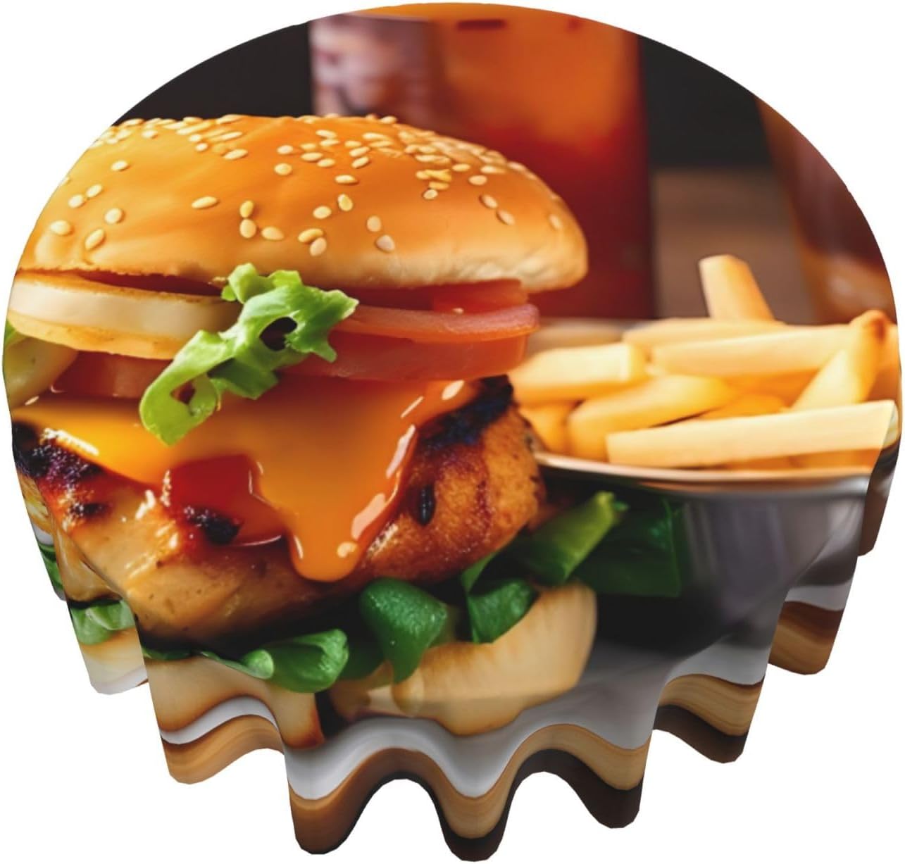 Made from premium peach skin velvet, the Chicken leg burger drink print Tablecloth provides a perfect blend of durability and softness. Its anti-wrinkle properties ensure that it stays smooth and neat, making it ideal for everyday use. This tablecloth protects your dining surface from damage while enhancing the aesthetic of your dining area with its classic, elegant print. The size of 60 x 60 inches fits most tables and adds a refined look to your space. Its washability makes it easy to maintain, ensuring that it continues to look beautiful for years to come.