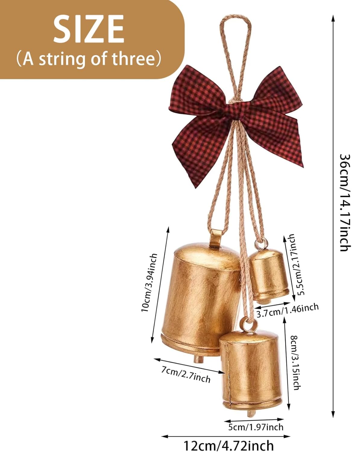 Description: Celebrate the Christmas season in style with our stunning 14-inch Gold Vintage Christmas Bells! These rustic cow bells boast a charming design, beautifully adorned with a jute hanging rope and a vibrant red tie bow, making them a delightful addition to your holiday decor. Perfect for hanging on doors, embellishing garden wreaths, or using as part of your festive displays, these metal bells bring a nostalgic and warm touch to any home. Crafted from quality metal, they're designed to last for years, ensuring they become a cherished part of your seasonal decorations. Whether you're looking to elevate your holiday decor or searching for the perfect gift to delight loved ones, these vintage Christmas bells are the ideal choice for creating lasting memories and spreading holiday cheer! Features:. Christmas Bells. -Color: As shown. -Material: Metal. -Size: length about 36 cm/14.17 inch. Note: Manual measurement, please allow slight errors on size. The colors may exist slight difference due to different screens. Package Including 1pc* Christmas Bells
