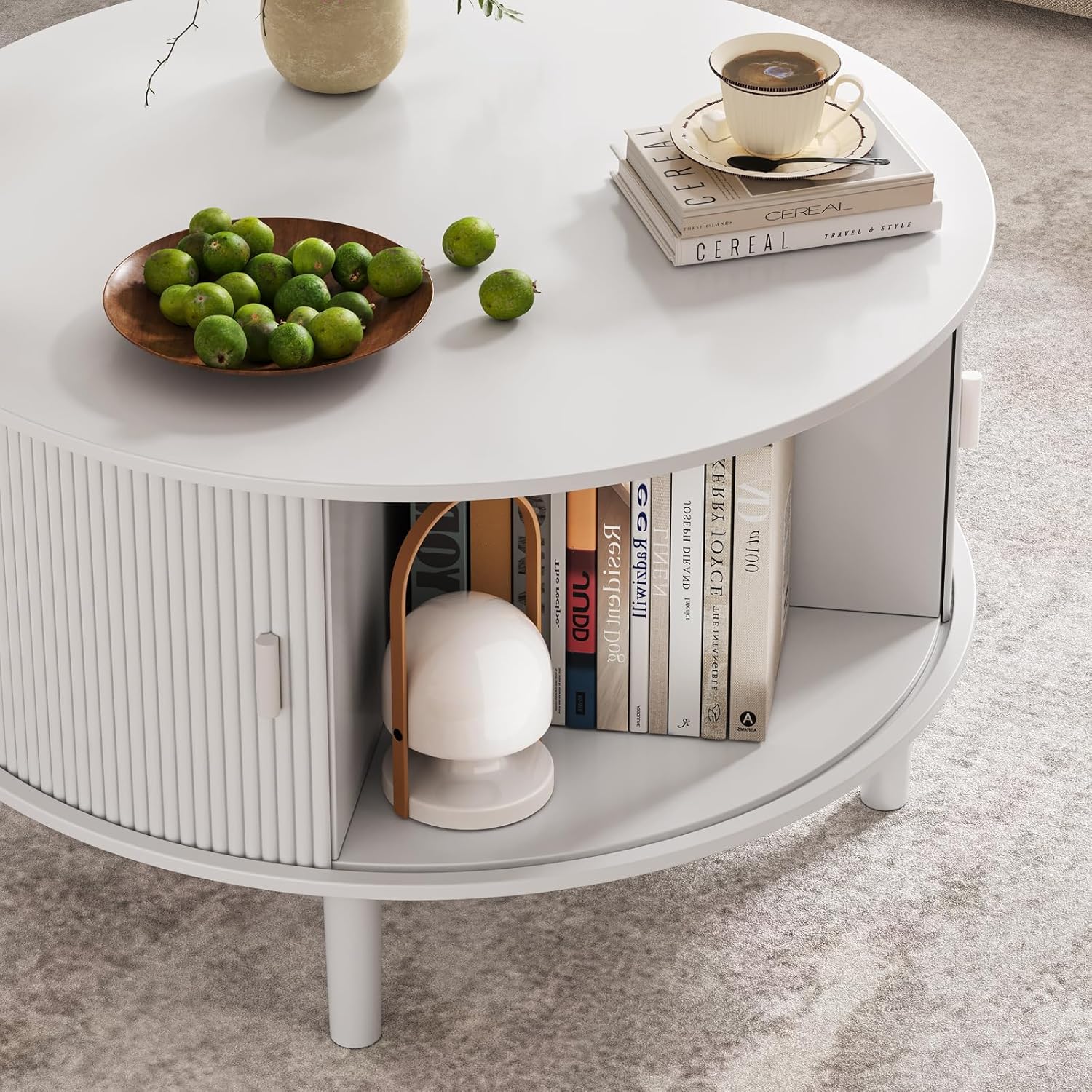 Coffee Table and TV Stand Sets of 2, Round Center Table with Storage, Fluted Table with 360°Curved Sliding Doors, Modern Entertainment Center for Living Room, Bedroom, Dining Room, White