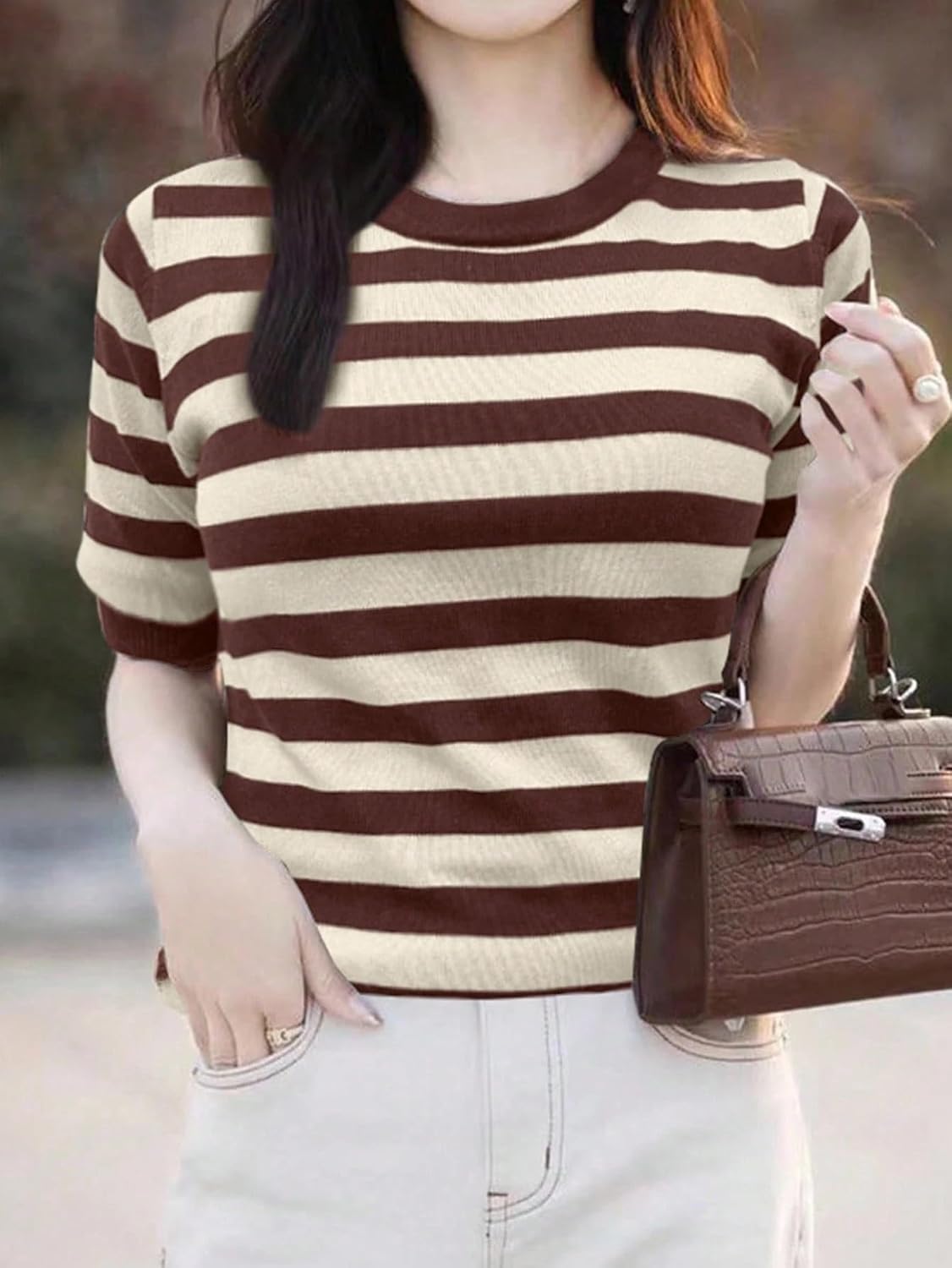 Versatile and perfect for any occasion: Autumn tops for women are perfect for various occasions and can be styled in multiple ways. Pair them with jeans or skirts for a casual look, or with a big sun hat or a cute bikini set for a chic look.Body Measurements:SHeight:65-66.9 in Bust:33.9-35.4 in Waist Size:26-27.6 in Hip Size:35.8-37.4 inMHeight:65-66.9 in Bust:35.4-37 in Waist Size:27.6-29.1 in Hip Size:37.4-39 inLHeight:66.9-68.9 in Bust:37-39.4 in Waist Size:29.1-31.5 in Hip Size:39-41.3 inProduct Measurements:SShoulder :13.8 in Length :20.9 in Sleeve Length :10 in Bust :33.1 in Cuff :7.9 in Bicep Length :11.4 inMShoulder :14.2 in Length :21.3 in Sleeve Length :10.3 in Bust :34.6 in Cuff :8.4 in Bicep Length :12 inLShoulder :14.6 in Length :21.9 in Sleeve Length :10.6 in Bust :37 in Cuff :9.3 in Bicep Length :12.8 inSleeve Length:Short SleeveNeckline:Round NeckPattern Type:Colorblock, StripedFabric Elasticity:Medium StretchTemperature:Spring/Fall (18-25℃/63-77℉)Sleeve Type:Regular SleeveHem Shaped:RegularFestivals:Independence DayLength:RegularDetails:Rib-KnitBody:UnlinedStyle:CasualOccasion:DailyFit Type:Slim FitCareful Washing Guidance: Machine wash gentle cycle with laundry bag or cold hand wash.
