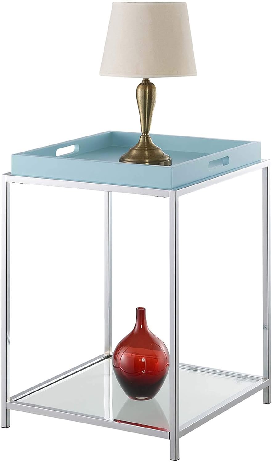 Add a minimalist dose of color to your living space with the Palm Beach End Table. This lovely piece by Convenience Concepts showcases a contemporary yet slightly elegant style; perfect to glam up any room in your home. This end table includes two shelves crafted from clear tempered glass and one reversible tray in the color of your choice. The multi-functional tray can be used on the top or bottom shelf to display favorite decorative pieces and collectibles. Hosting does not get any easier thanks to the cut-out handles of the MDF-crafted tray; allowing for easy cleanup if needed. The frame of this simple piece is engineered from chrome-plated steel for long-term durability and easy maintenance. Add additional beautiful pieces from the Palm Beach Collection by Convenience Concepts; each sold separately.