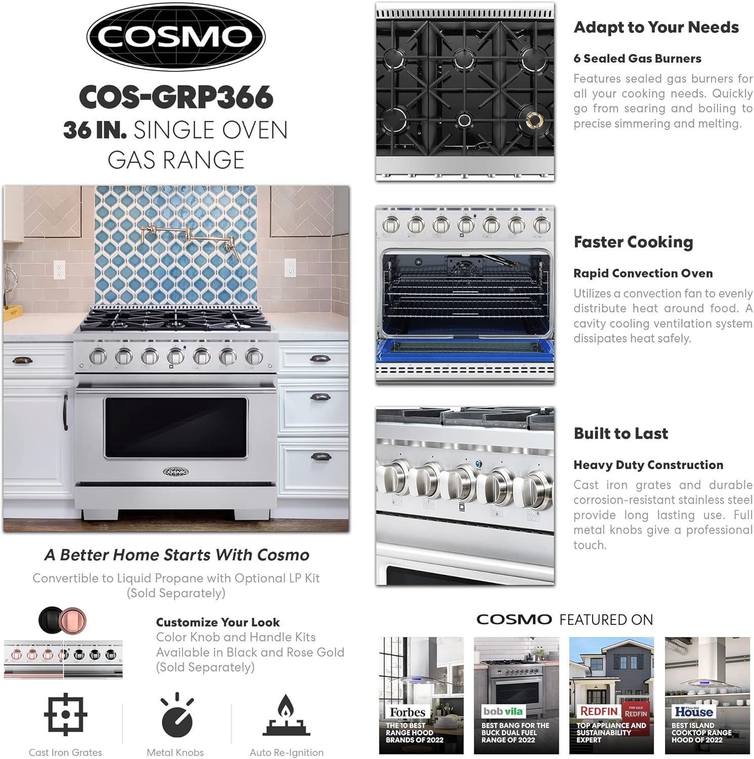 Cosmo's COS-GRP366 36 in. gas range brings professional styling and quality into your home kitchen. The large 4. 5 cu. ft. oven capacity lets you bake for a crowd, and the gas cooktop with 6 sealed Italian-made burners can handle all your pots and pans with ease. The cooktop is equipped with a variety of different burners to suit needs from the largest pots and pans down to the most delicate sauces: 1 x 20,000 BTU, 1 x 15,000 BTU, 1 x 12,000 BTU, 2 x 9,000 BTU and 1 x 6,000 BTU. In the rapid convection oven, powerful dual fans circulate air for fast, perfectly cooked meals every time. Four special oven functions give you the precision to create everything from juicy roasts to delicate desserts. Designed for durability, this 36 in. gas range is constructed with industrial, corrosion resistant 304 grade stainless steel. A removable backsplash means this range is suitable for either freestanding or slide-in installation. A 30 inch model (COS-GRP304) is available for smaller spaces.