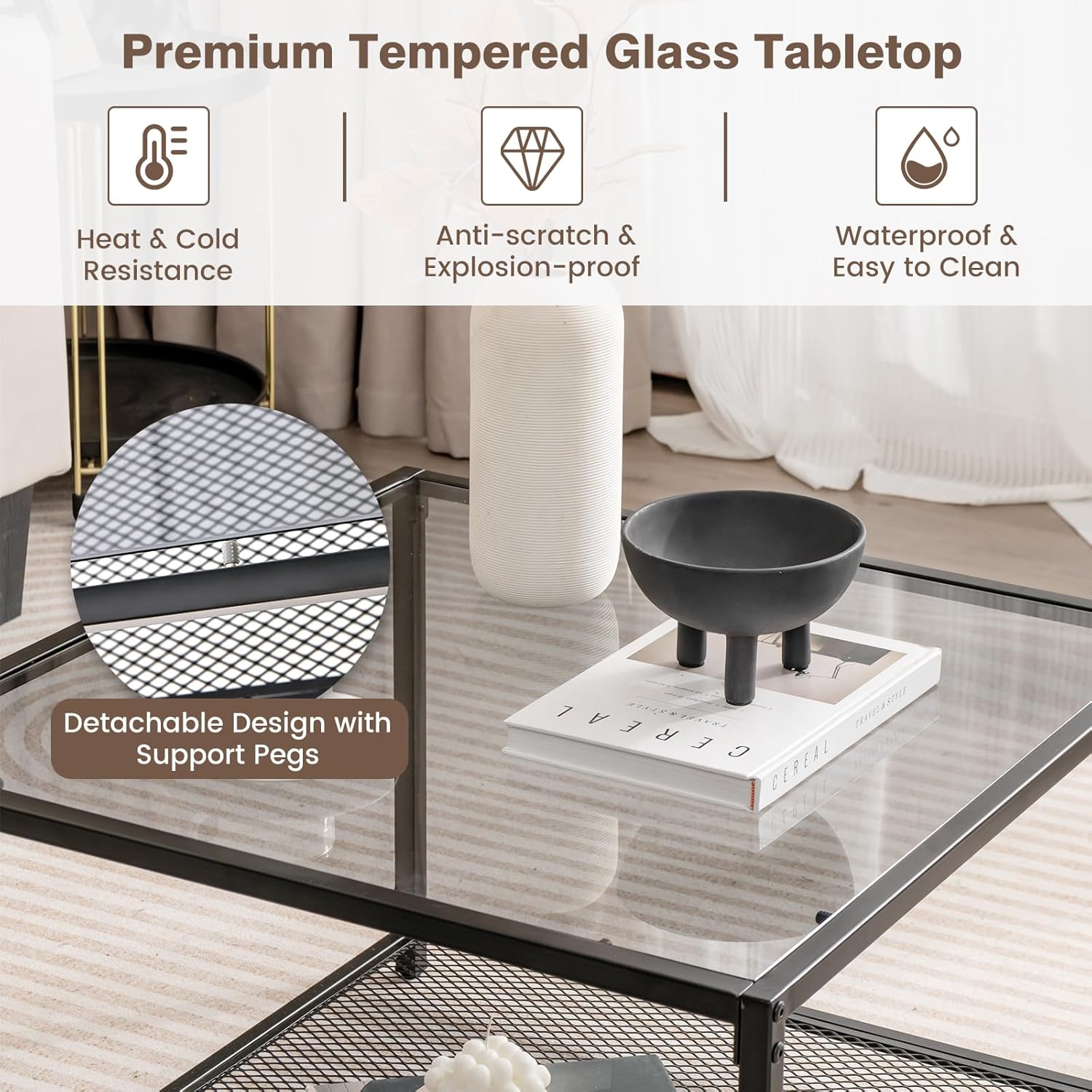 Description Our modern coffee table features a contemporary design that effortlessly blends stylishness with functionality. Featuring a high-quality tempered glass tabletop and sturdy metal frame, this center table is incredibly strong and durable. Its simple, modern styling adds a touch of sophistication to any room. Large tabletop provides plenty of room for your everyday essentials. And detailed instruction manual ensures easy installation. There's no doubt this reliable and versatile coffee table will add highlight to your home decoration. Feature Square glass-top coffee table adds beauty to your interior space Support pegs and strong connections ensure a reliable structure Lower iron mesh shelf and wide glass tabletop for laptops, coffee, and books High-quality tempered glass top is anti-scratch and explosion-proof Adjustable foot pads protect floors and ensure stability Robust metal tube for large weight capacity of 110 lbs Minimalist design fits any living room, bedroom, or office Quick installation with detailed instruction Specification Color: Gray & Black/Transparent & Black Material: Tempered Glass, Metal Overall Dimension: 27.5” x 27.5” x 18”(L x W x H)/70 x 70 x 45 cm (L x W x H) Weight Capacity of Tabletop: 110 lbs/50 kg Weight Capacity of Mesh Shelf: 44 lbs/20 kg Net Weight: 21 lbs Package Includes: 1 x Coffee Table 1 x User Guide