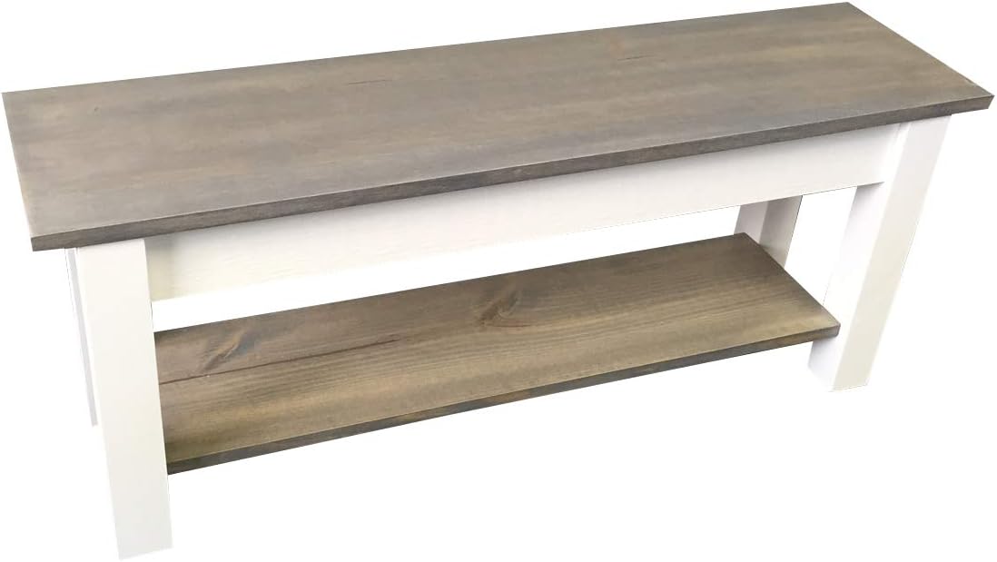 The Cottage bench has a polished driftwood grey top and classic white legs. This collection is designed to relax and brighten a dark room. With neutral colors of white and grey, this bench will go with anything, and the bench has a shelf built in for added functionality. Dimensions: 17" tall, 12" deep, Multiple lengths available- choose the length you need from the drop down.