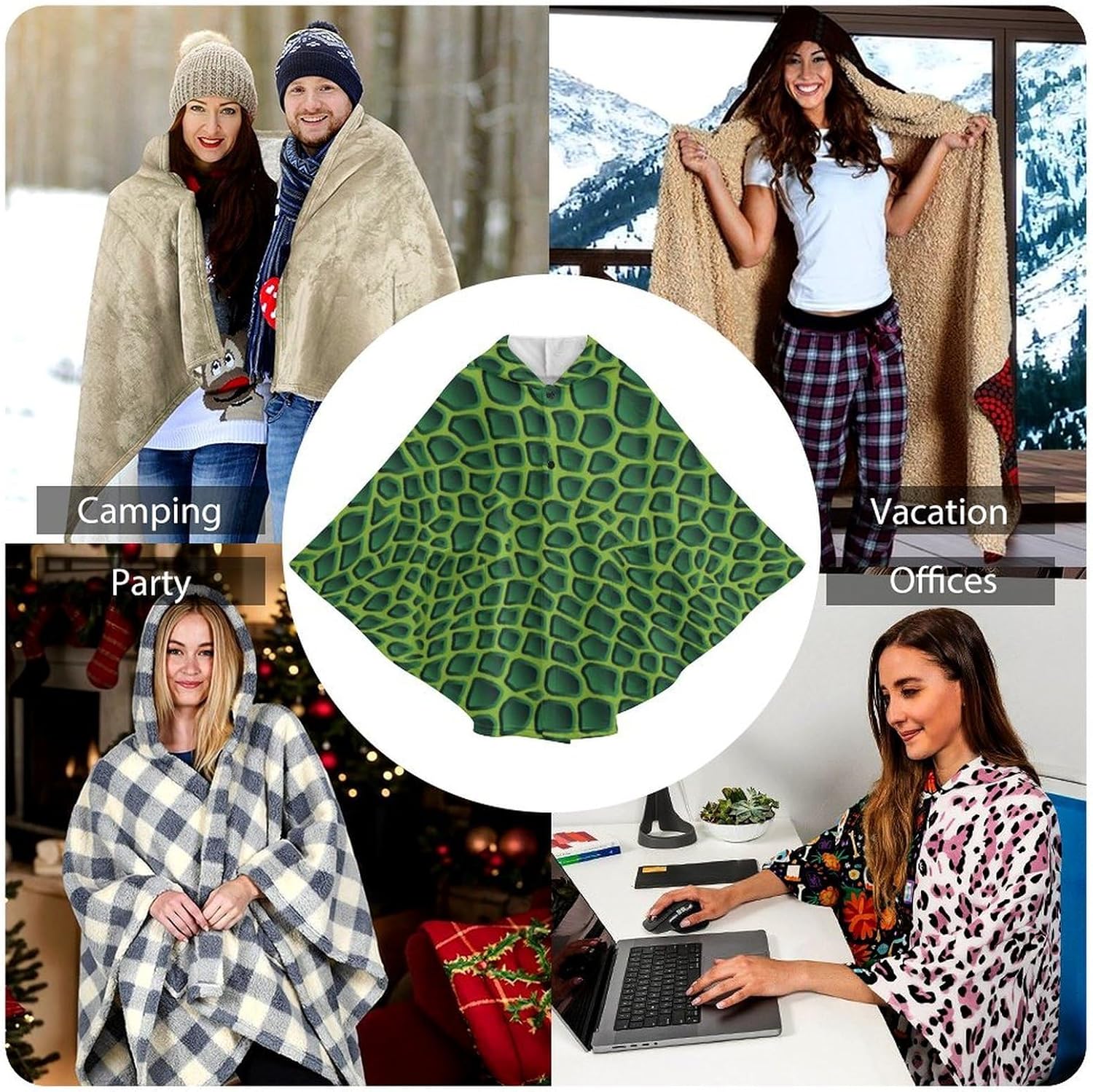 The wearable blanket is made of soft and comfortable flannel fabric, which makes you feel warm in spring, autumn and winter. It has a cape-like shape, a button closure for easy wearing and taking off, and two pockets.