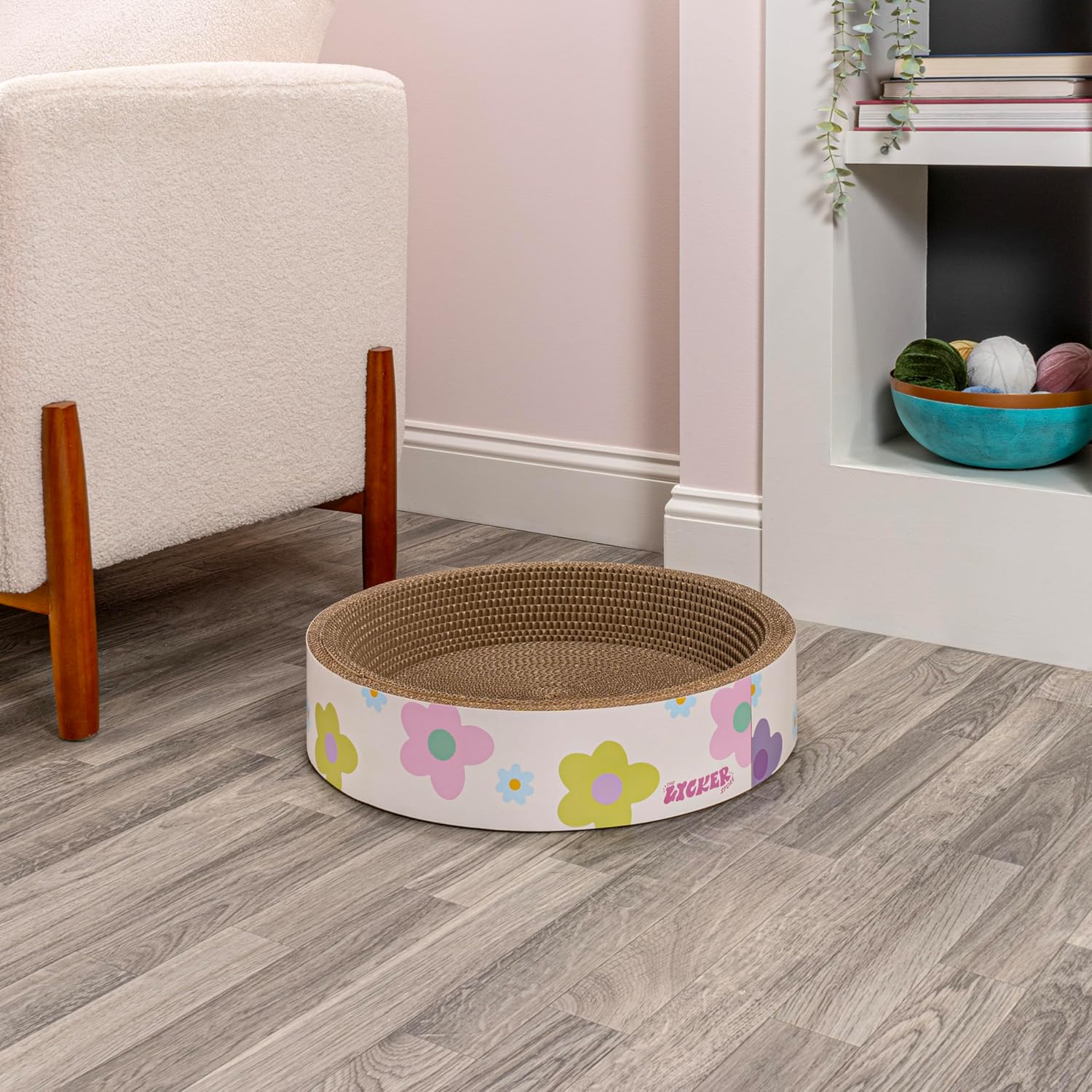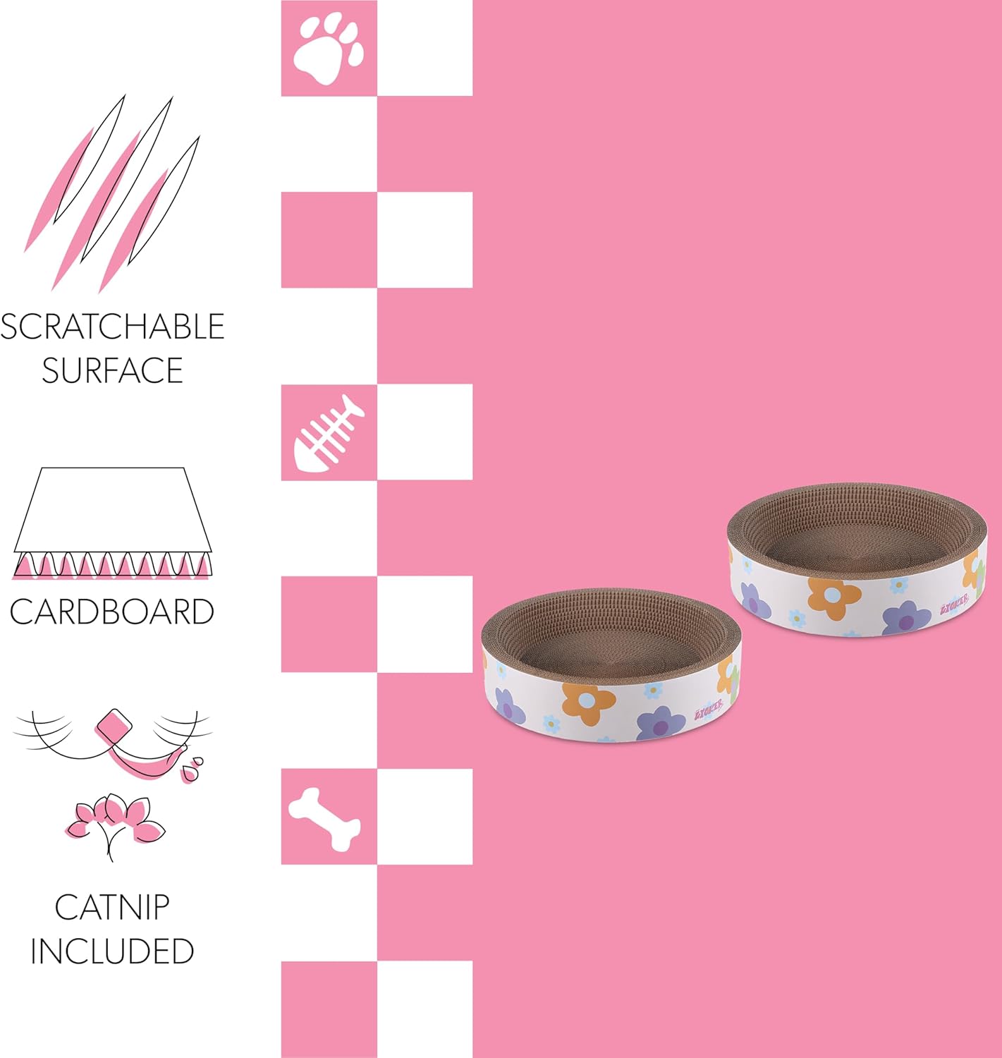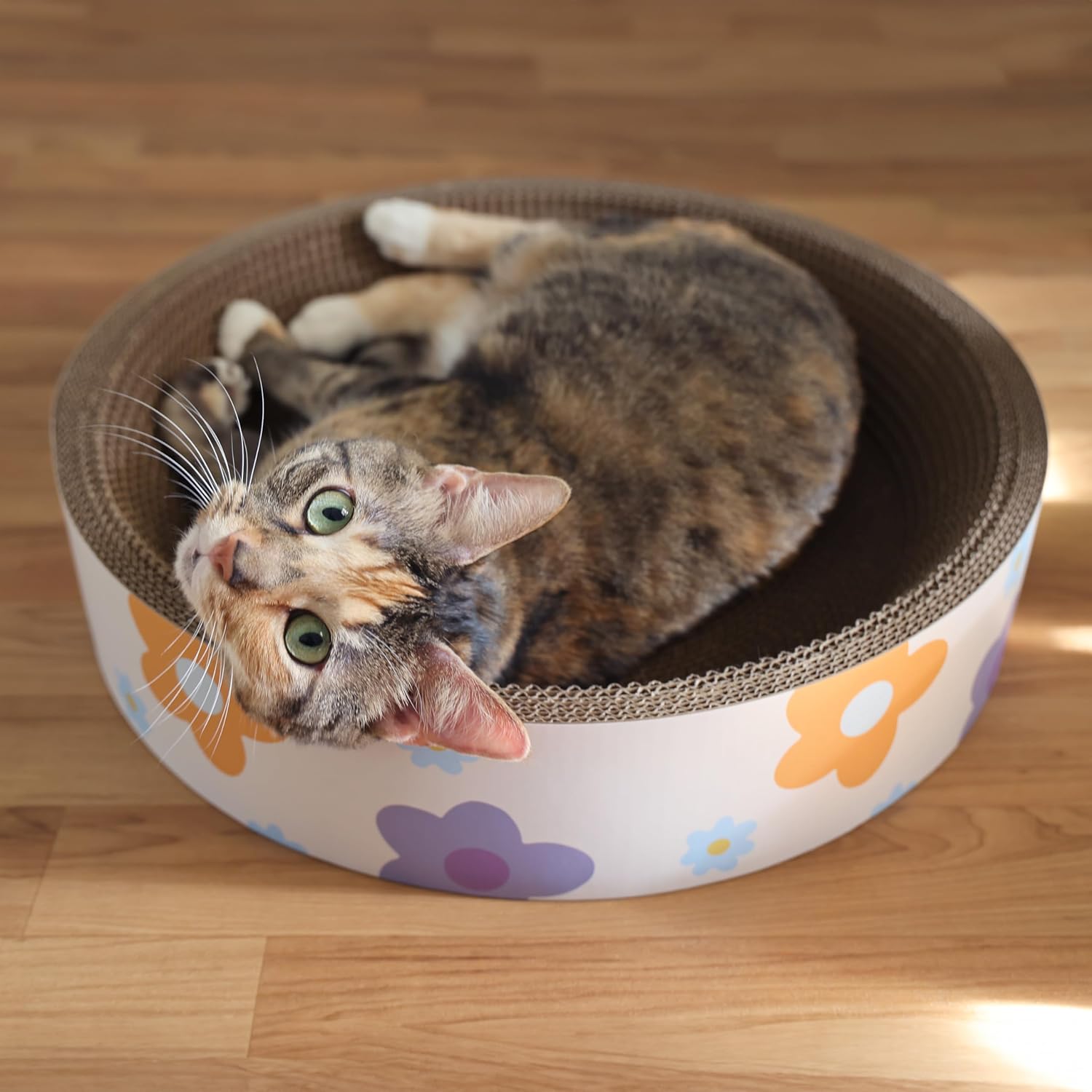 Our cozy cat-scratcher bowls are perfect for active scratching and relaxed snuggling. Set of two bowls has a corrugated cardboard interior and a modern floral design around the outside. Use one now and save one for later, or scatter them around the house as cat beds.