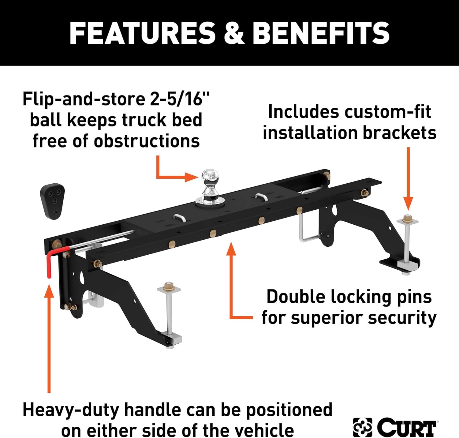 A CURT gooseneck hitch is more than a necessary tool for towing; it is an integrated extension of your truck that allows you turn your 4x4 into the workhorse it was designed to be. That is why CURT offers gooseneck hitch kits that include both the hitch and the installation brackets, making it simpler and easier to get your truck towing-ready. This kit includes the CURT Double Lock gooseneck hitch and installation brackets to match. The under-bed Double Lock gooseneck hitch gets its name from the two locking pins that engage the trailer ball and hold it in place, giving you twice the security when towing especially heavy trailers. The Double Lock mounts underneath your truck bed, using the included brackets, and provides a removable 2 5/16" gooseneck trailer ball with a gross trailer weight capacity up to 30,000 lbs. and a tongue weight capacity of 7,500 lbs. Using the heavy-duty operating handle, the trailer ball can be unlocked and flipped over whenever necessary to allow full use of the truck bed. The Double Lock comes with solid safety chain hookups, an attractive chrome trim ring, a durable A-coat finish and a limited lifetime warranty. This particular Double Lock gooseneck hitch kit is design to be a custom fit for certain years of the Dodge Ram 1500 (for a complete listing of vehicle and installation bracket compatibility, see application info).
